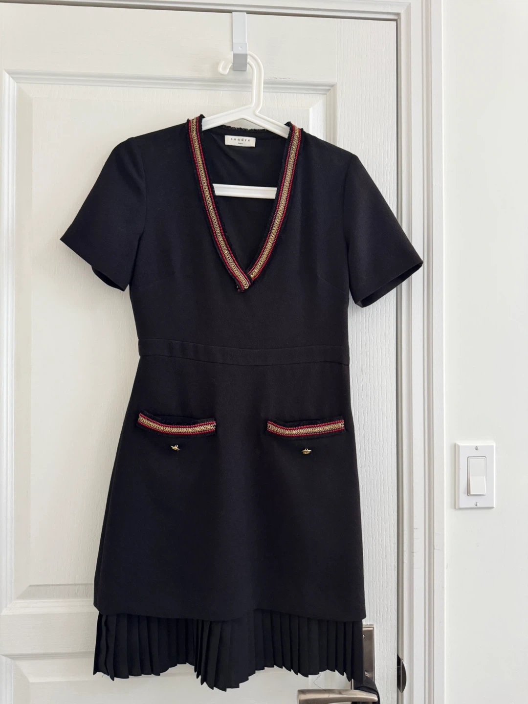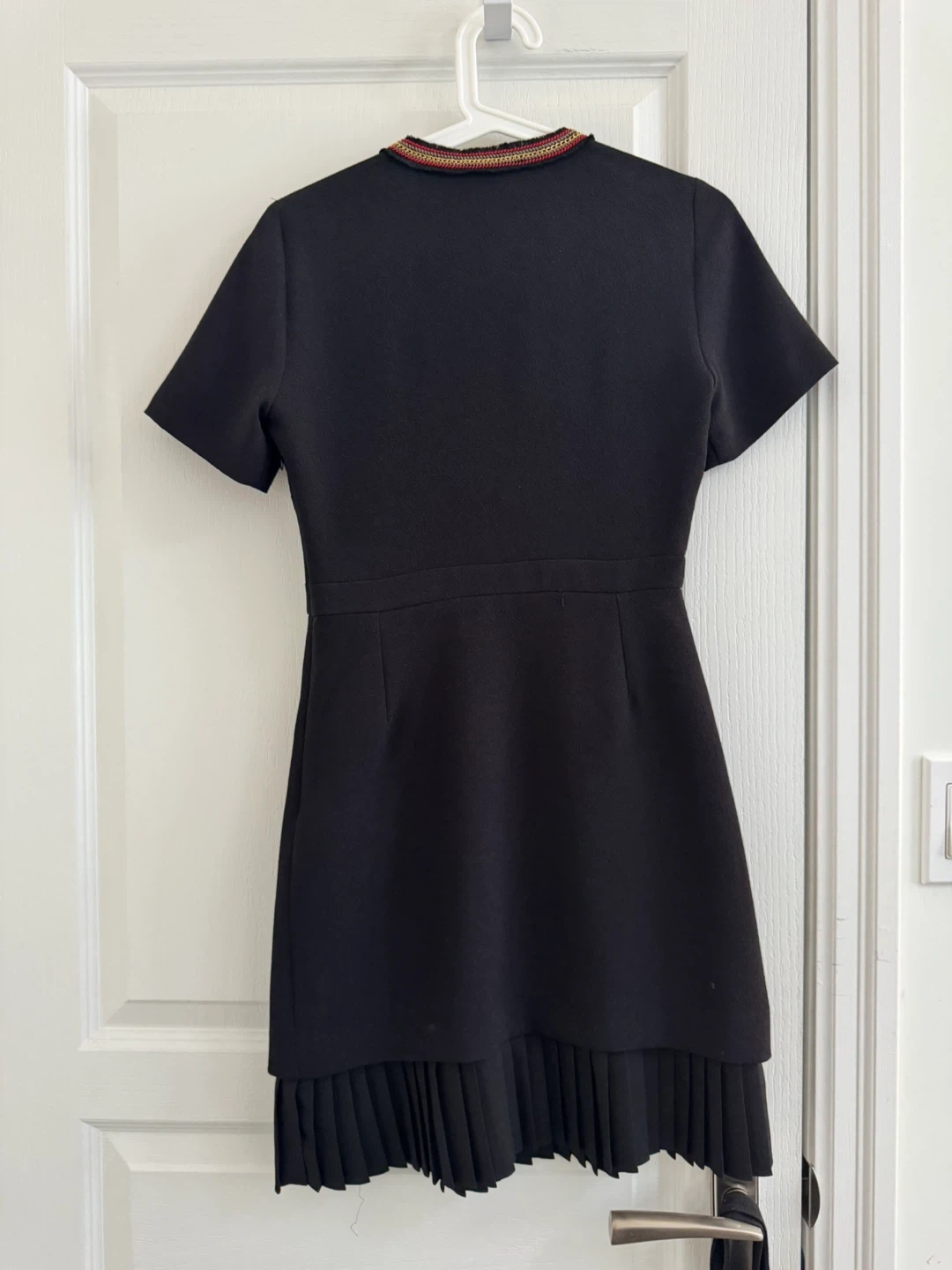 size 34. It's in great condition and features a unique design with decorative trim and a pleated skirt.