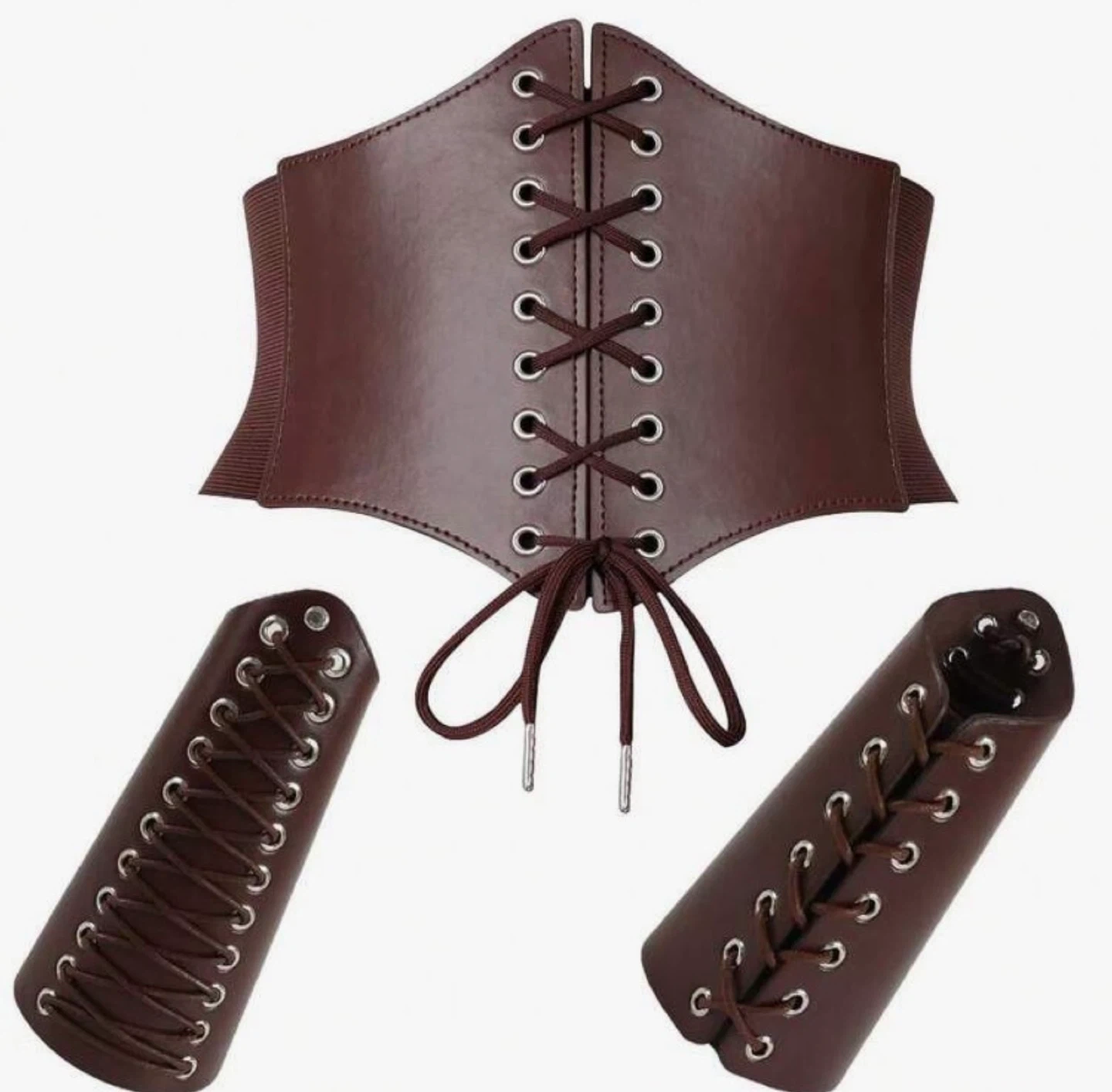 Selling a stylish brown leather corset belt and arm cuffs set. This set features a unique design with metal rings and accents, perfect for adding a touch of edgy flair to any outfit. The corset belt has an elastic band for a comfortable fit. Great condition!
