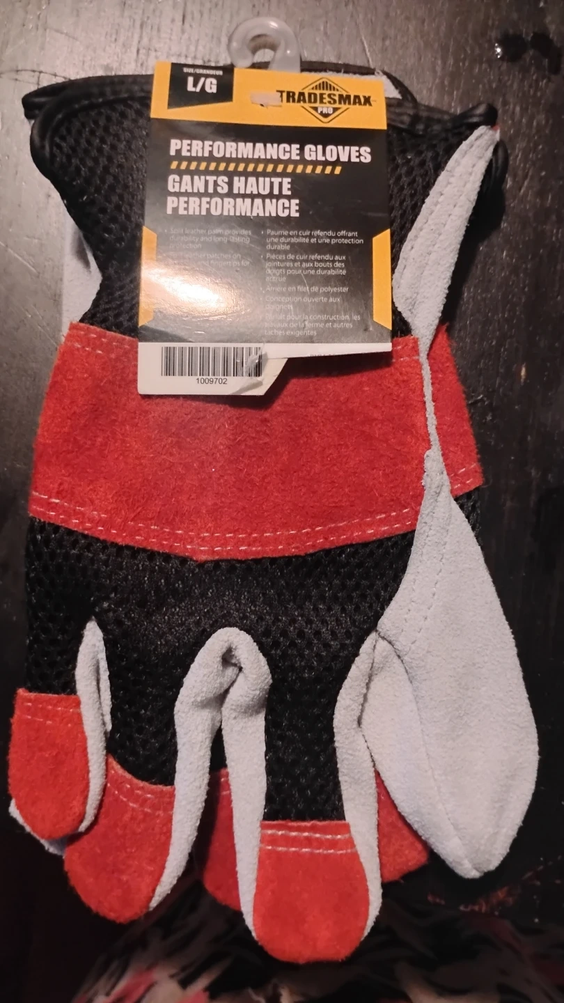 28Tradesmax Pro Performance Gloves in size L/G Features: - Split leather palm for durability and long-lasting protection - Leather patches on knuckles and fingertips - Polyester mesh back for open design - Suitable for construction, farm work, and other demanding tasks