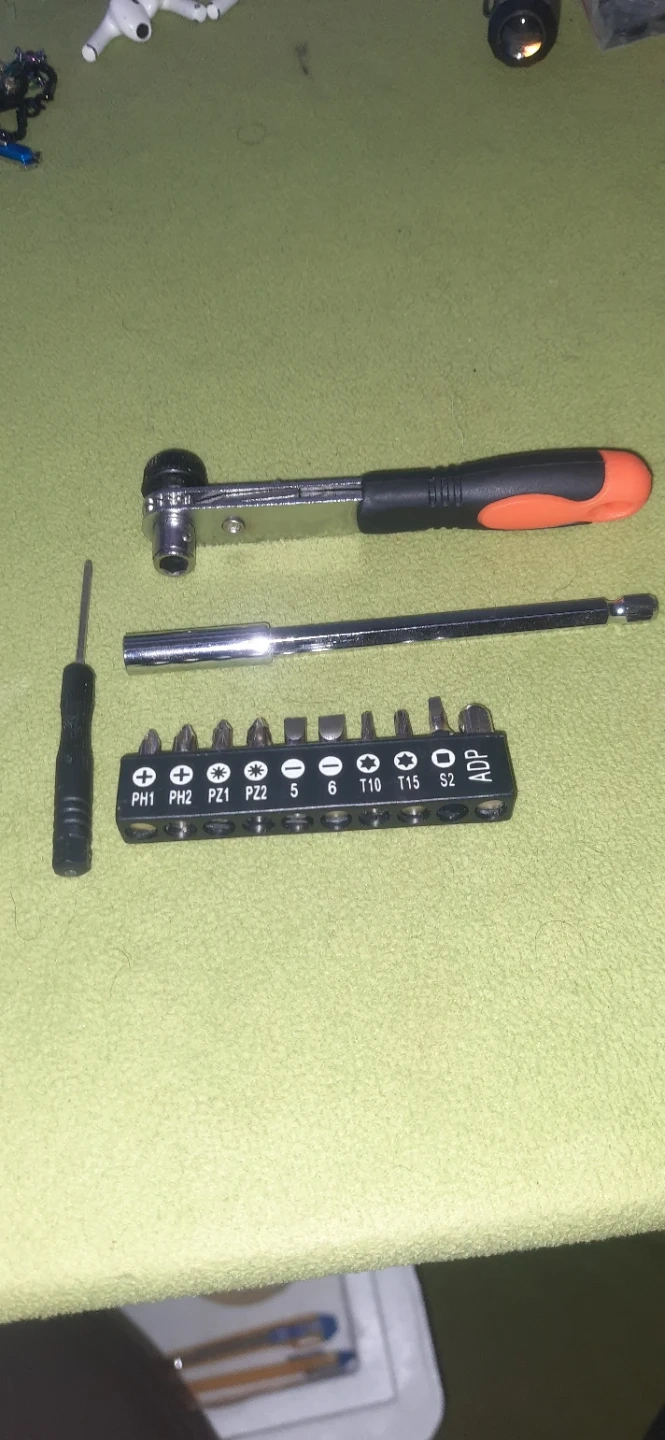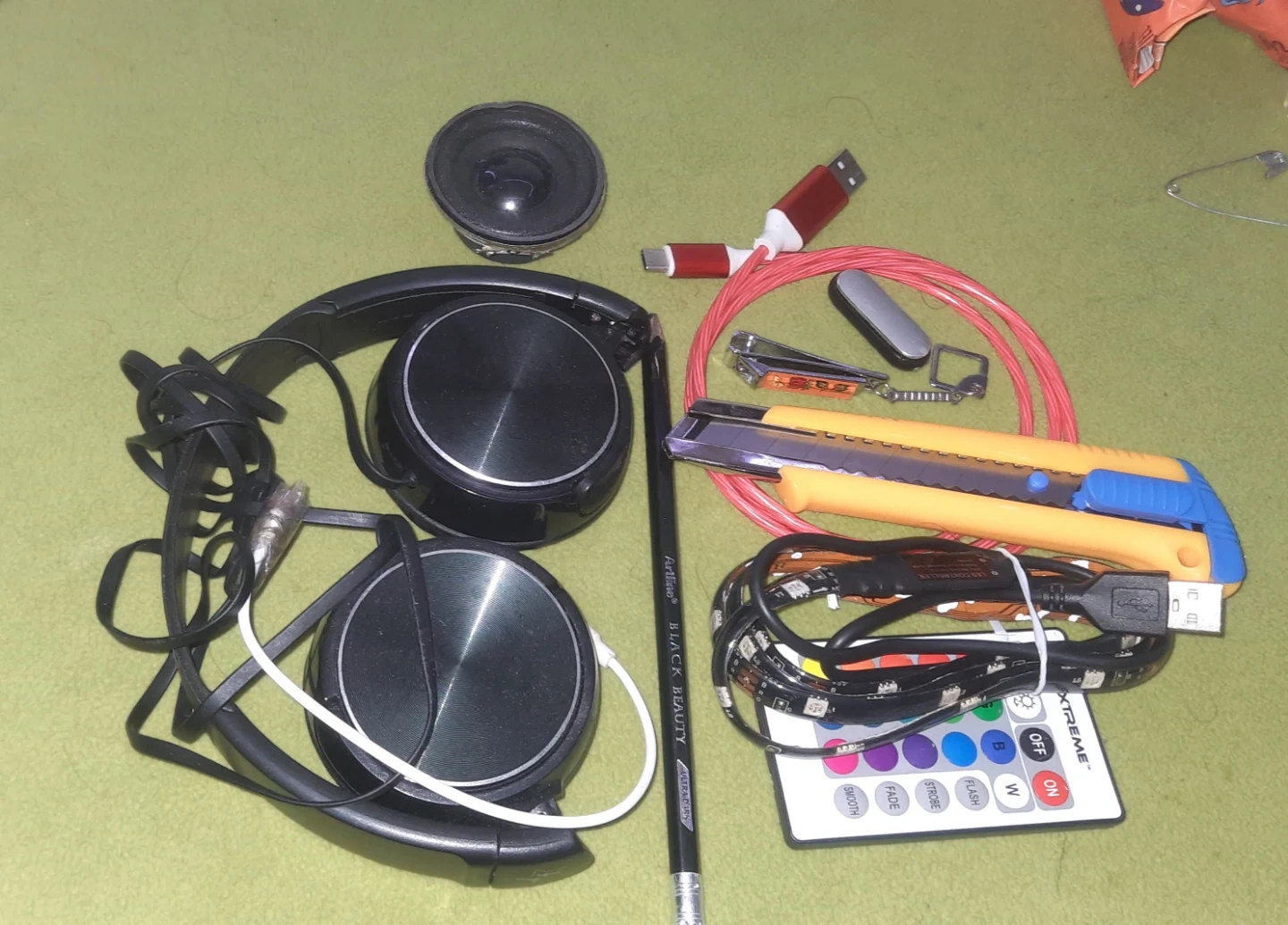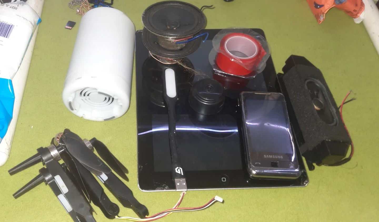 Selling a mixed lot of electronics components and devices. Includes speakers, an old iPad, a Samsung phone, drone parts, headphones, and various electronic components like wires and resistors. Great for hobbyists or those looking to tinker!