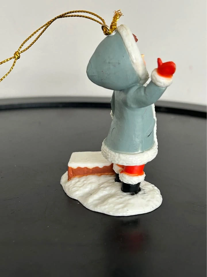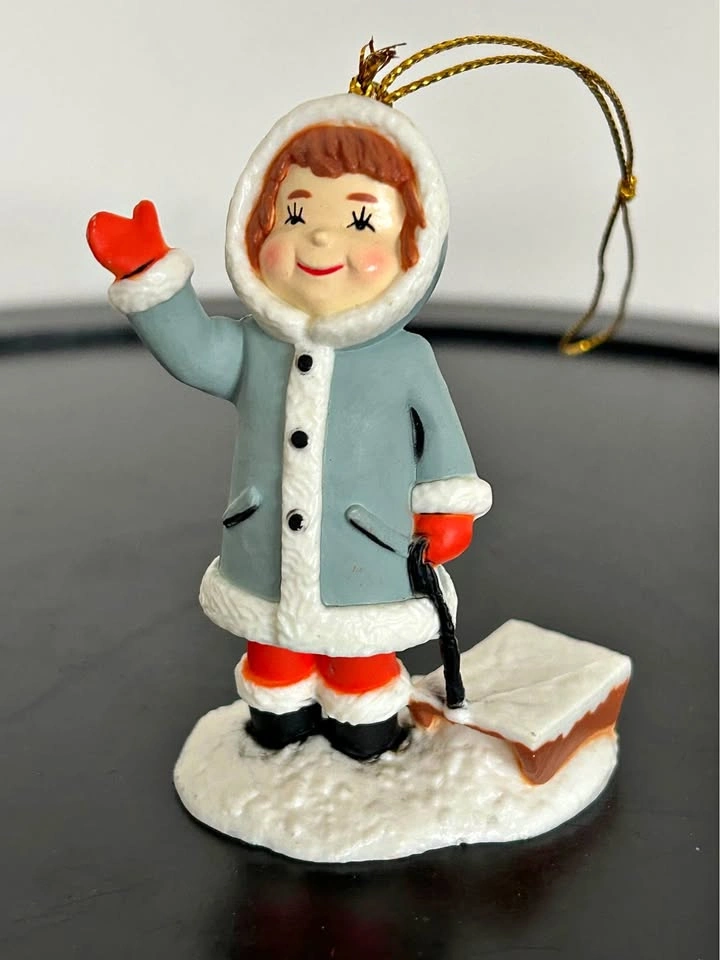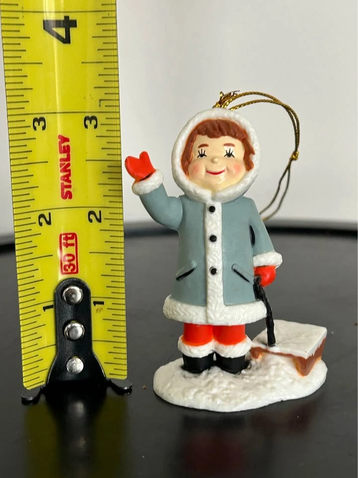 Charming vintage-style Christmas decor figurine featuring a cheerful girl in a blue winter coat, red mittens, and boots, waving while pulling a snow-covered sled. Made of hand-painted resin with lovely nostalgic details, perfect as a hanging ornament or small tabletop display. Adds a cozy, storybook touch to your holiday decorations.