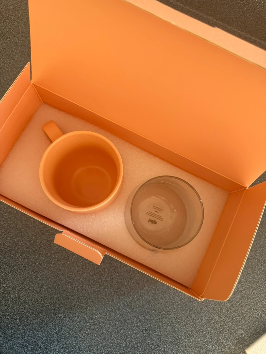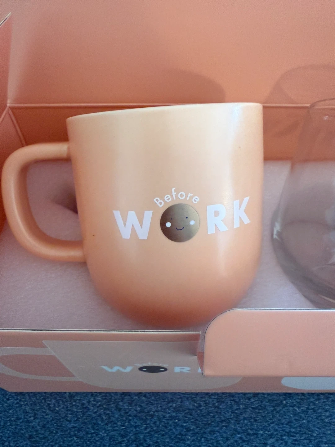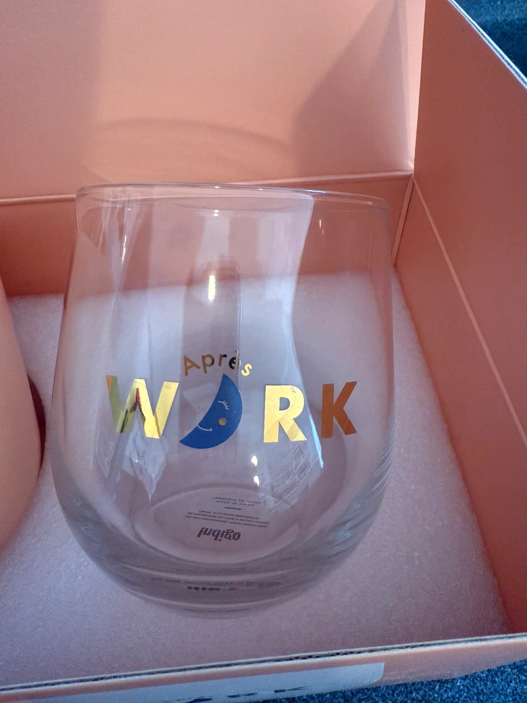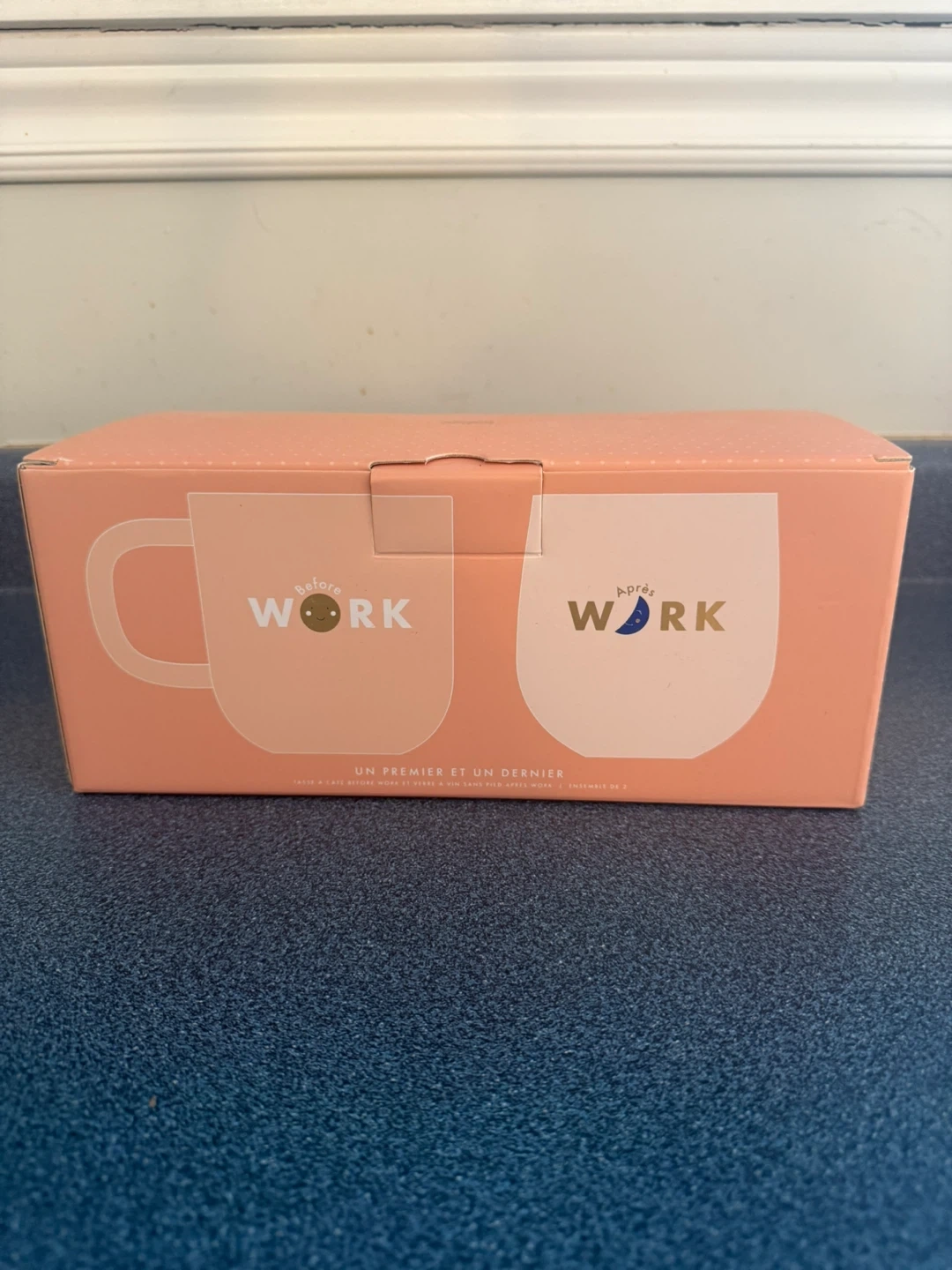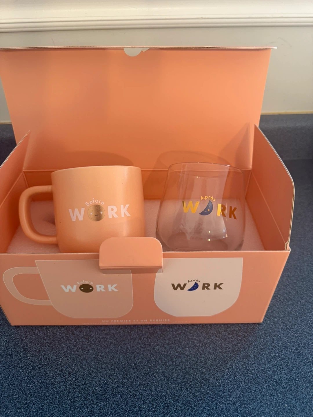 I'm selling a brand new mug and wine glass set! It includes one mug labeled "Before Work" and one wine glass labeled "Après Work" Both are in perfect condition and come in the original box