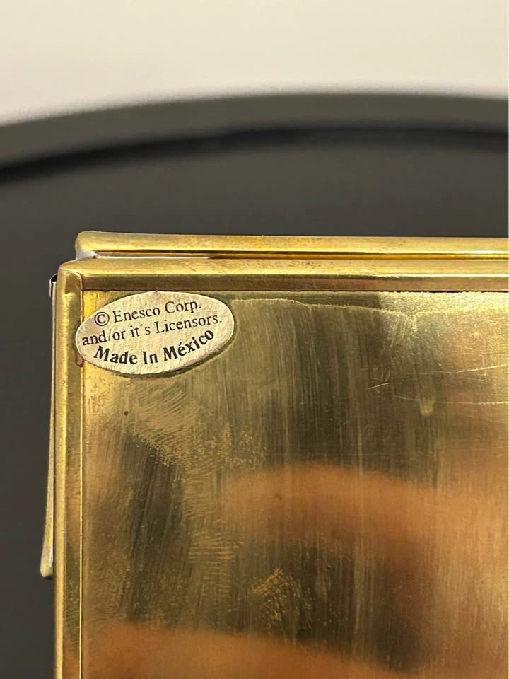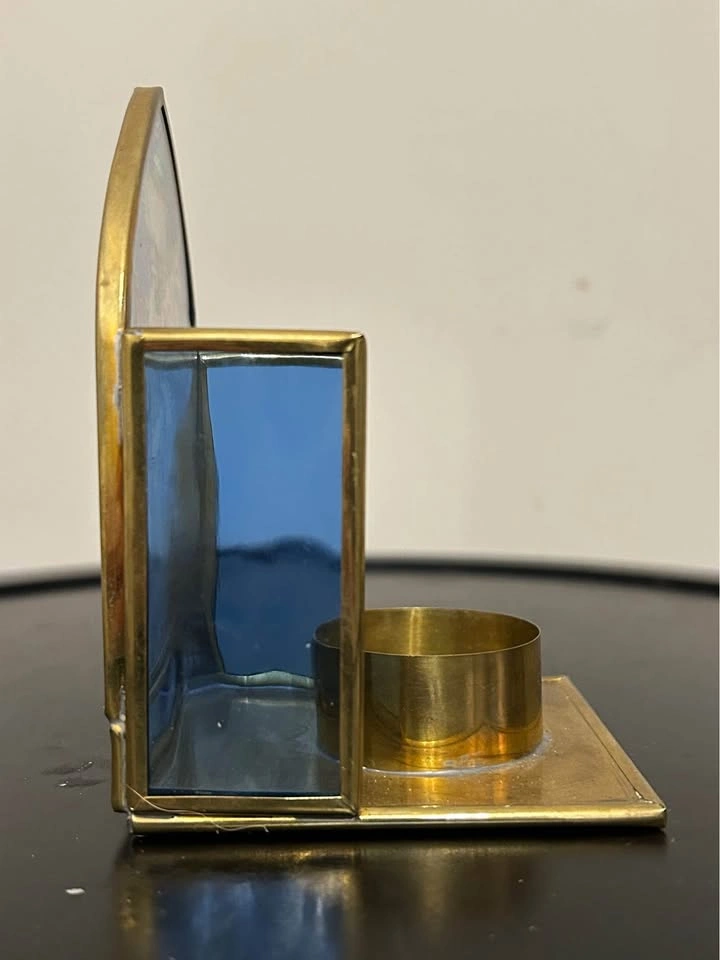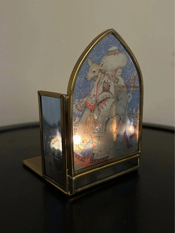 Beautiful vintage brass and glass tealight holder by Enesco Corp., made in Mexico. Features a stunning Father Christmas scene in winter attire with reindeer, depicted in warm, detailed colors. When a candle is lit inside, the light softly illuminates the artwork, creating a cozy and festive glow. Perfect accent piece for your Christmas decor or holiday collection.