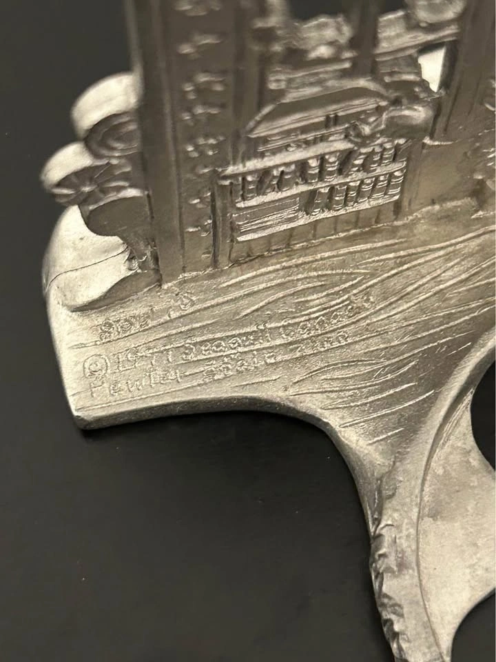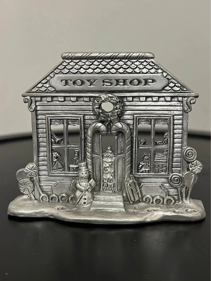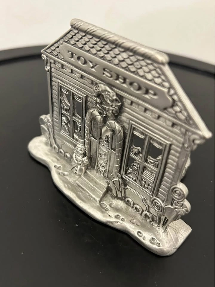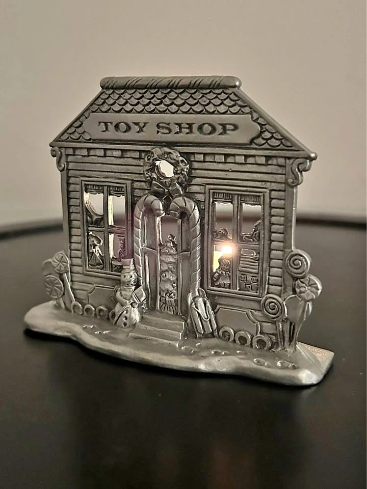 Charming vintage pewter tealight holder shaped like a “Toy Shop.” Beautifully detailed with festive motifs — snowman, wreath, rocking horse, and Christmas toys. Made by The Seagull Pewter Company (Canada). When lit, the light shines warmly through the windows, creating a cozy Christmas village effect. A perfect collectible or gift for your holiday decor.