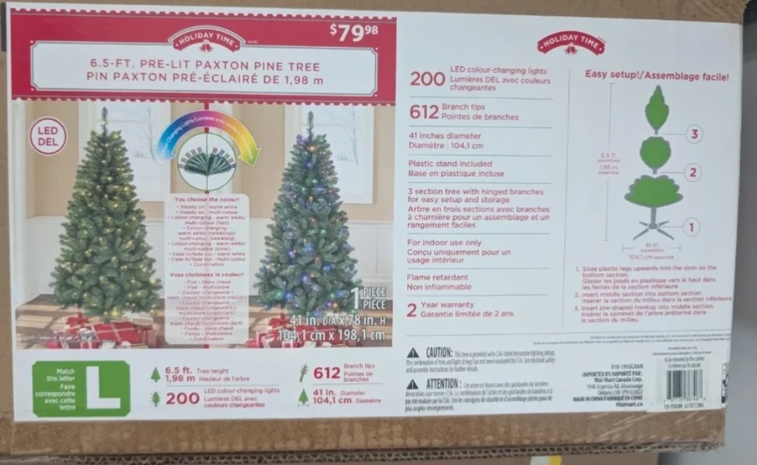 Selling a Holiday Time 6.5 ft Pre-Lit Paxton Pine Tree! It features 200 LED colour-changing lights, 600 branch tips, and a 41 inch diameter. It comes with a plastic stand included and is easy to assemble!