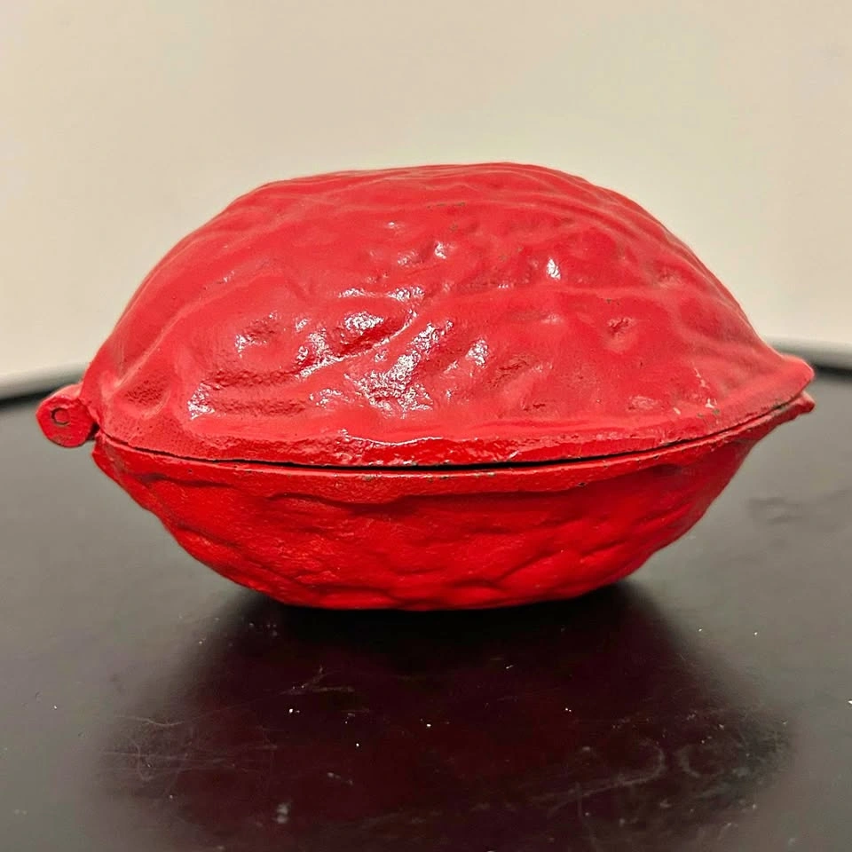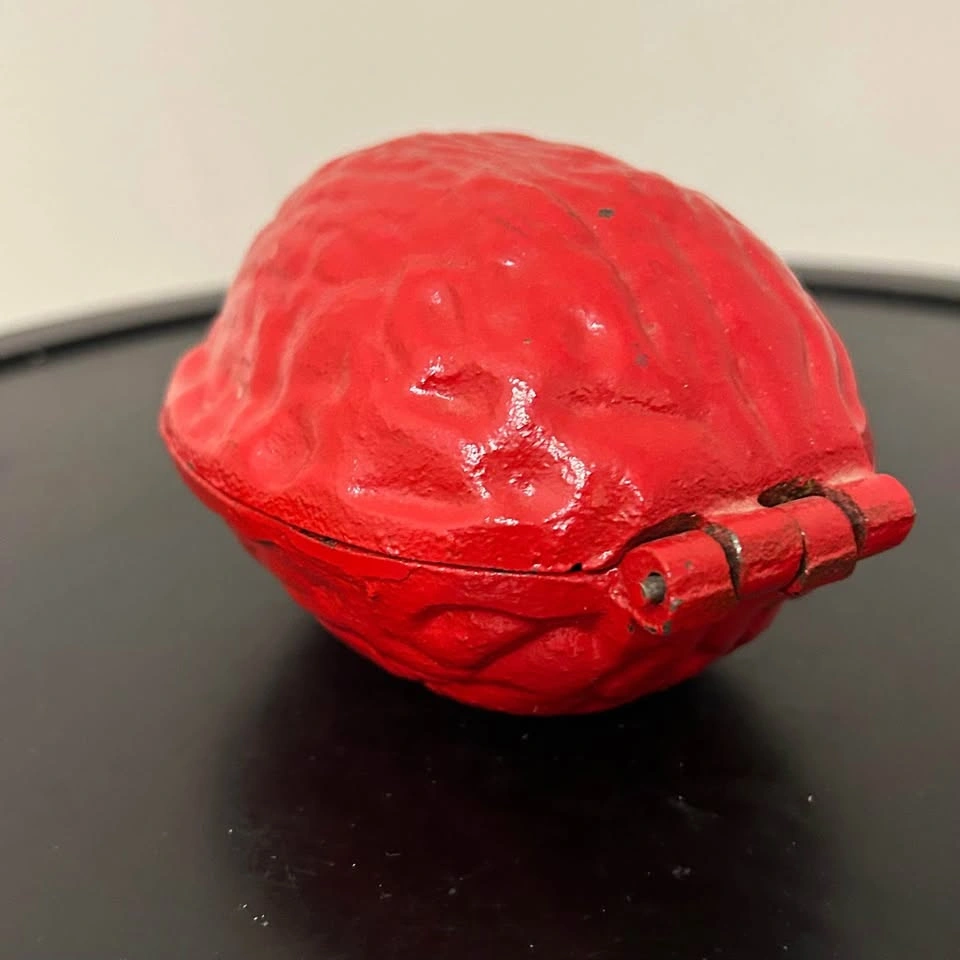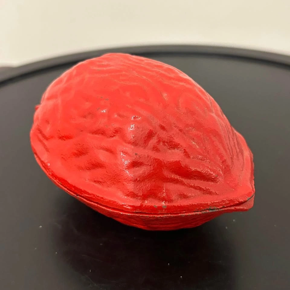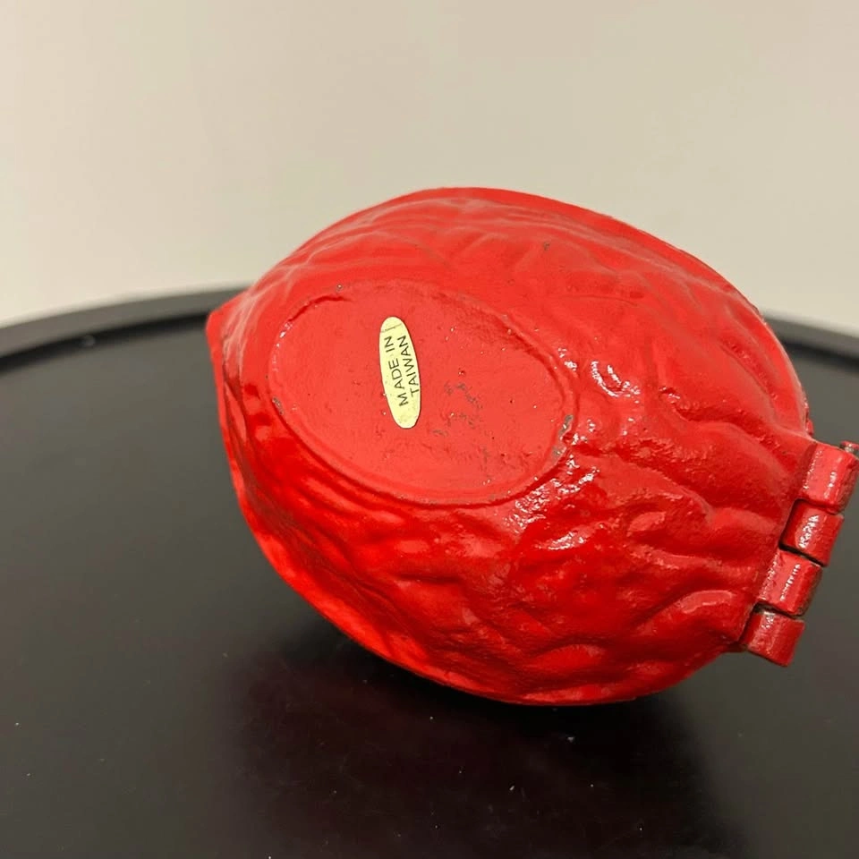 Charming vintage cast iron nutcracker shaped like a walnut and painted bright red. Opens on a hinge to reveal the nut-cracking mechanism inside. Made in Taiwan, likely mid-20th century. A fun and festive collectible that adds a nostalgic touch to your Christmas decor — both decorative and functional.