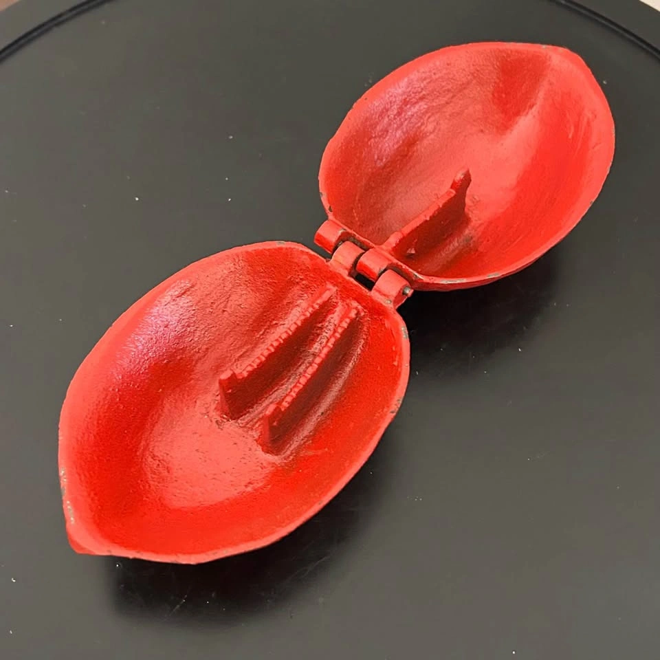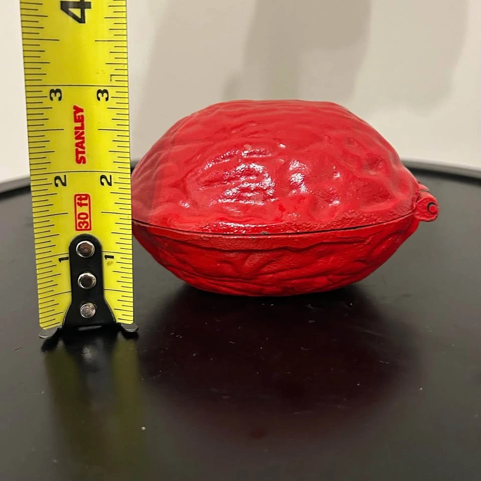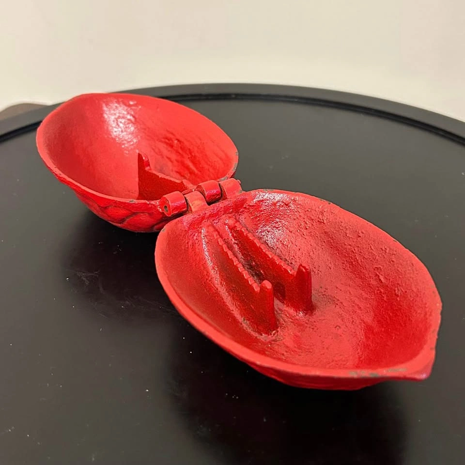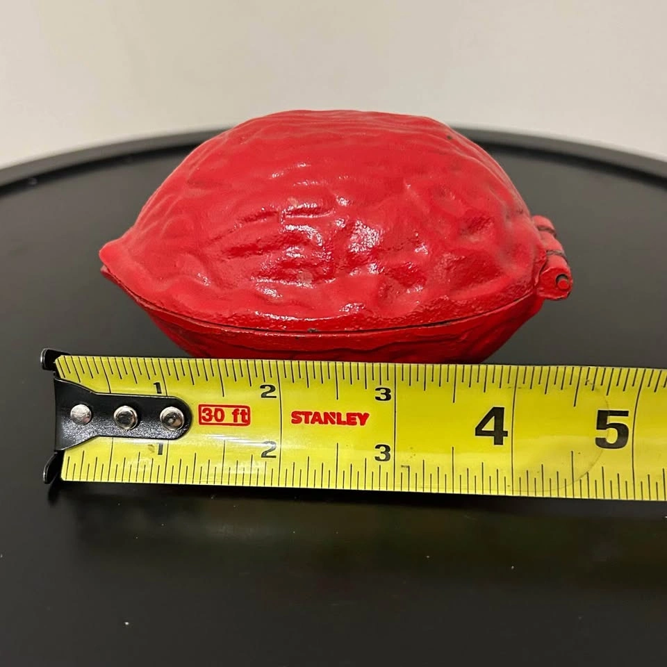 Charming vintage cast iron nutcracker shaped like a walnut and painted bright red. Opens on a hinge to reveal the nut-cracking mechanism inside. Made in Taiwan, likely mid-20th century. A fun and festive collectible that adds a nostalgic touch to your Christmas decor — both decorative and functional.
