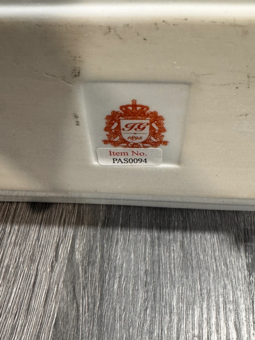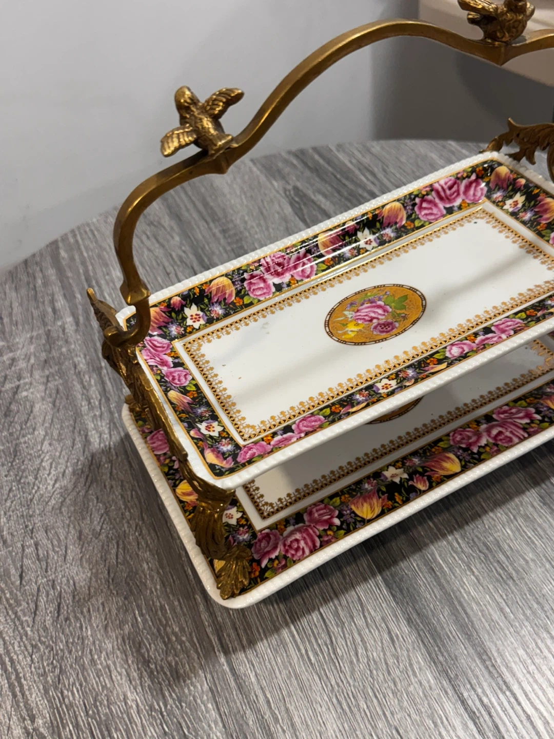 10Selling a lovely two-tier serving tray from TG! It features a beautiful floral design with gold accents and an ornate gold-tone handle. Perfect for serving treats or displaying decorative items
