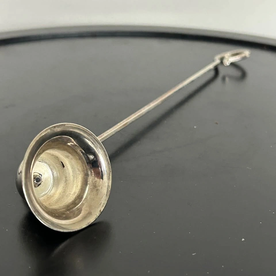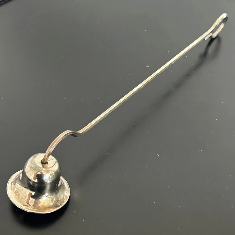 Elegant vintage silver-plated candle snuffer with a classic bell-shaped head and curved handle. Designed to safely extinguish candles without smoke or wax splatter, this timeless piece brings a touch of sophistication to any home or altar setup.