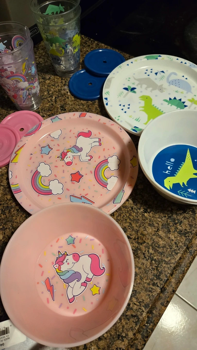 30A cute set of dishes for kids! Includes plates, bowls, and cups featuring fun dinosaur and unicorn designs. Everything has 2 sets π Used only couple of times. Cups dont have straws. Entire set for $10. Pick up Markham between 14th Ave and 9th Line.