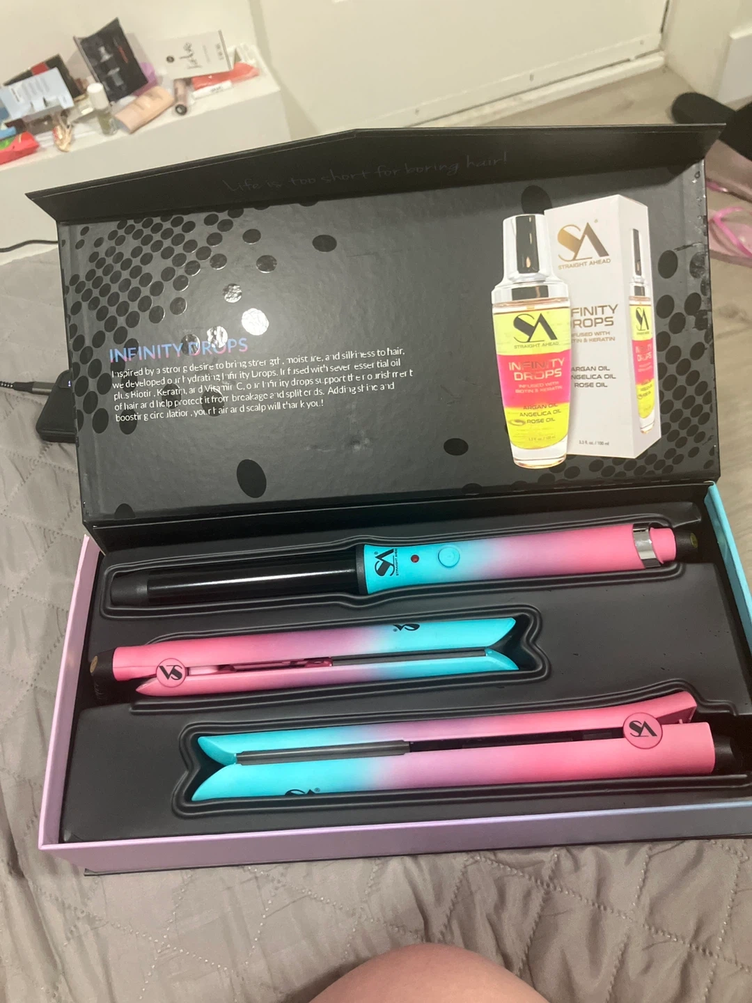 Selling a Straight Ahead Bionic Trio Set! It includes a Bionic Pro Iron 1" Styling Wand with a Clip Free Barrel. Originally bought for $820. Usd Comes with the box and a heat resistant glove