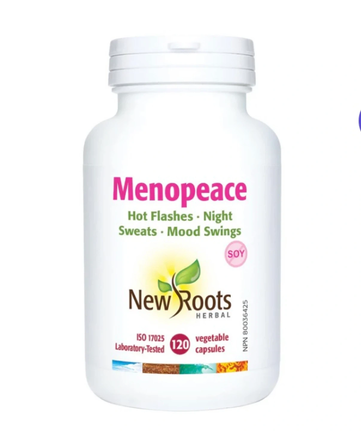 Selling a bottle of New Roots Menopeace, containing 120 vegetable capsules. This herbal supplement is designed to help with hot flashes, night sweats, and mood swings. It's laboratory-tested and contains soy.