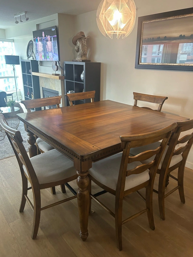 Selling a stunning, solid wood square dining table set with 6 matching chairs – perfect for anyone looking to add warmth, style, and durability to their home. Features: • Real solid wood – not particle board • Beautiful rich wood grain and craftsmanship • Counter-height design – modern, comfortable, and great for entertaining • Includes 6 sturdy ladder-back chairs with comfortable padded seats (light fabric) • Gently used and in excellent condition – no wobbles, no damage Approximate Dimensions: • Table: 54” x 54” (square) • Height: 36” counter height • Chairs: Seat height approx. 24” Super sturdy and stylish – great for hosting dinner parties, family meals, or game nights. This set is heavy and built to last, not your typical box-store furniture. For Sale By: Owner