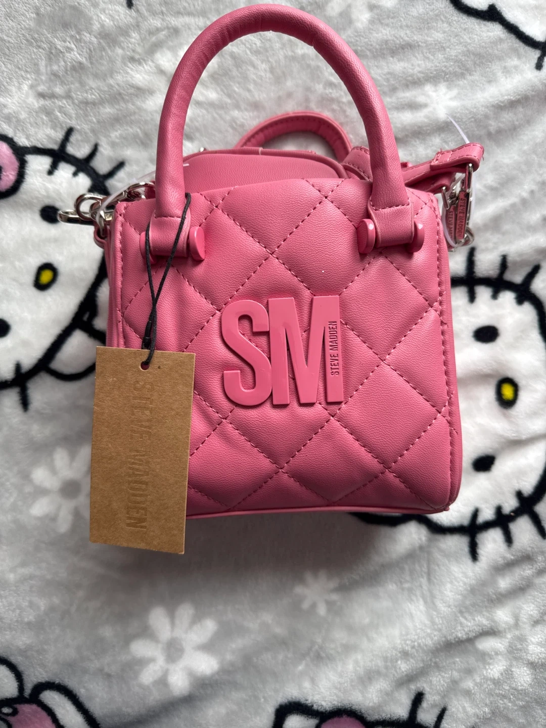 This is a brand new Steve Madden micro tote bag in pink! It's super cute and perfect for carrying small essentials. It has a quilted design with the Steve Madden logo. Comes with a detachable strap and a small coin purse!