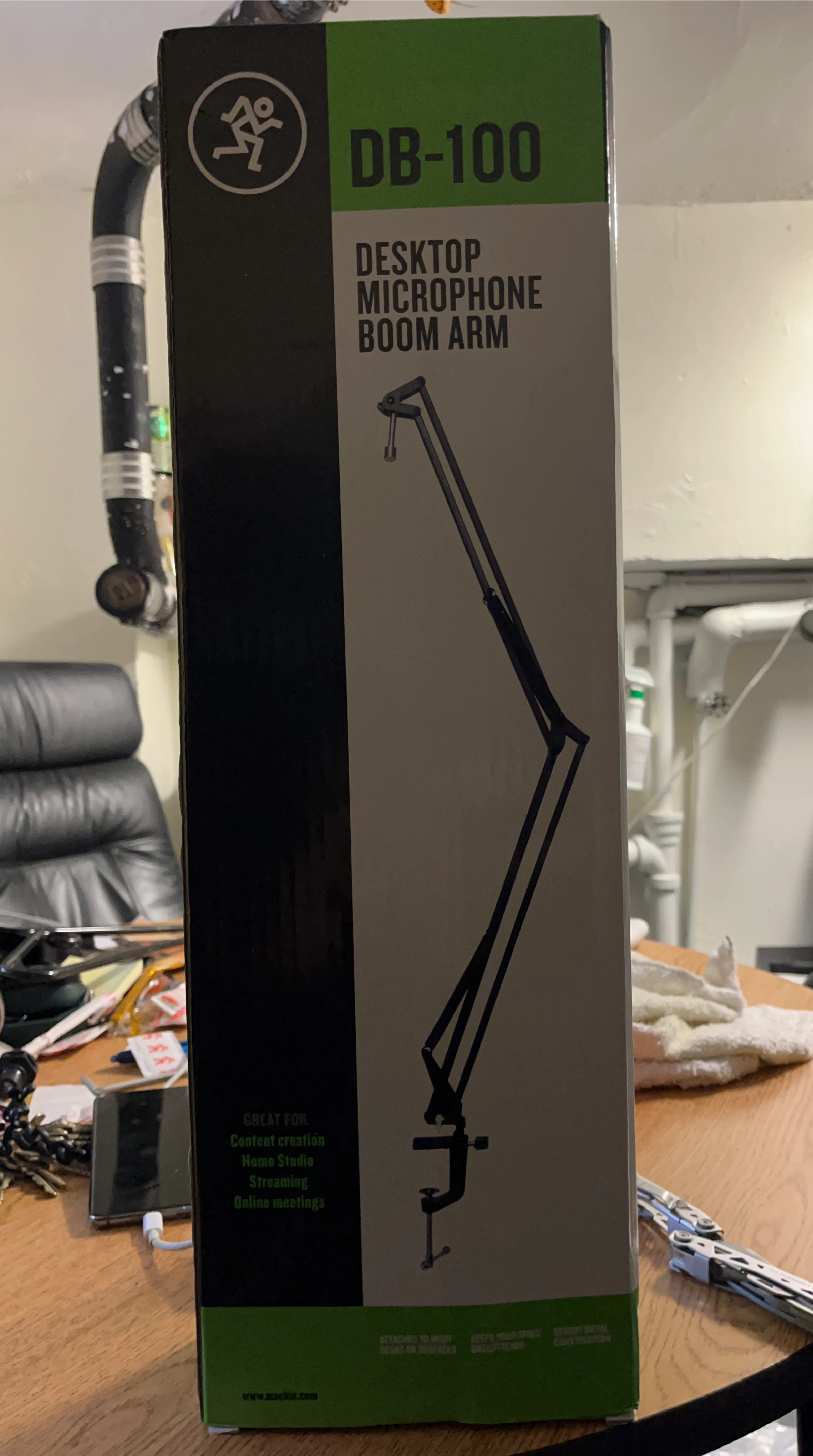 Selling a new Mackie DB-100 Desktop Microphone Boom Arm. It's great for content creation, home studio, streaming, and online meetings. It attaches to most desks or surfaces and keeps your space uncluttered. Features sturdy metal construction. Comes in the original box