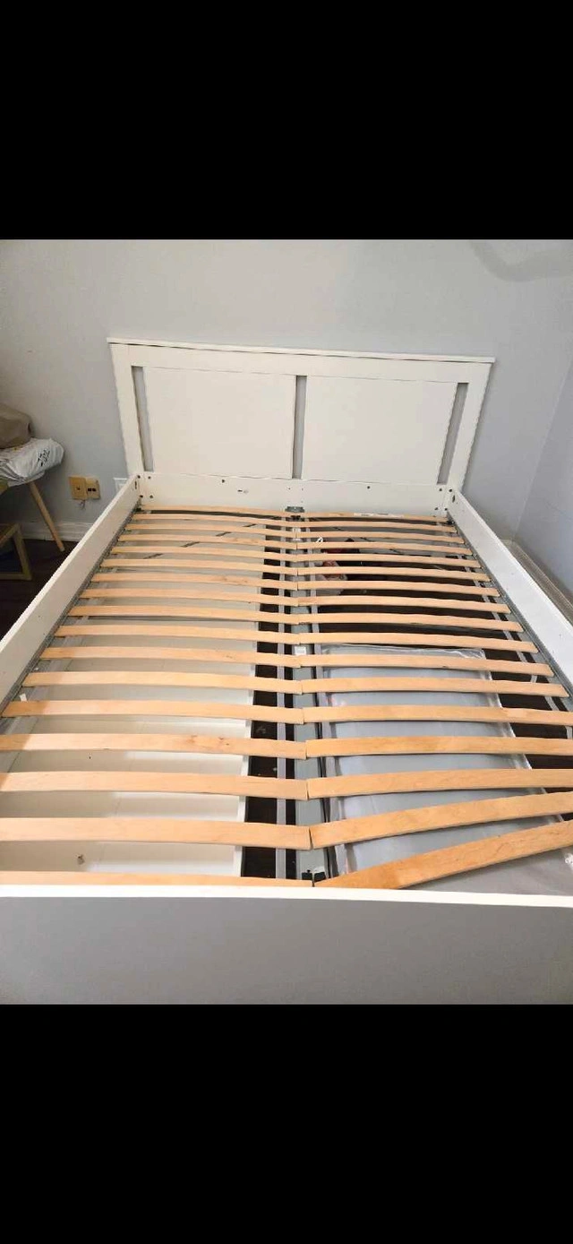10This is a used IKEA queen size bed frame, offering both style and functionality for your bedroom. While it shows signs of wear from previous use, it remains sturdy and reliable. The bed frame includes a headboard and side rails, providing a classic and timeless look. Additional features include: * Durable construction * Classic design * Easy to assemble. If the ad is up, it's still available! I have priced it accordingly.