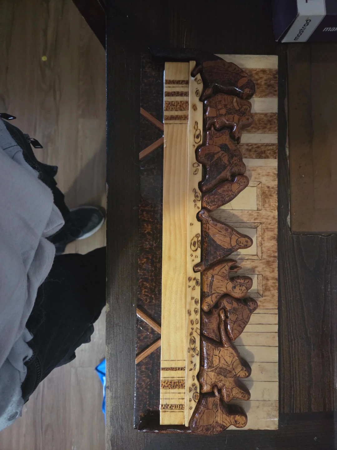 Selling a hand-carved wooden art piece. The piece features a detailed depiction of a scene, showcasing skilled craftsmanship. It would make a lovely addition to any home!