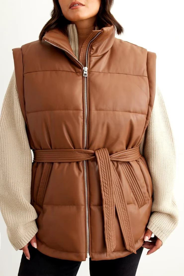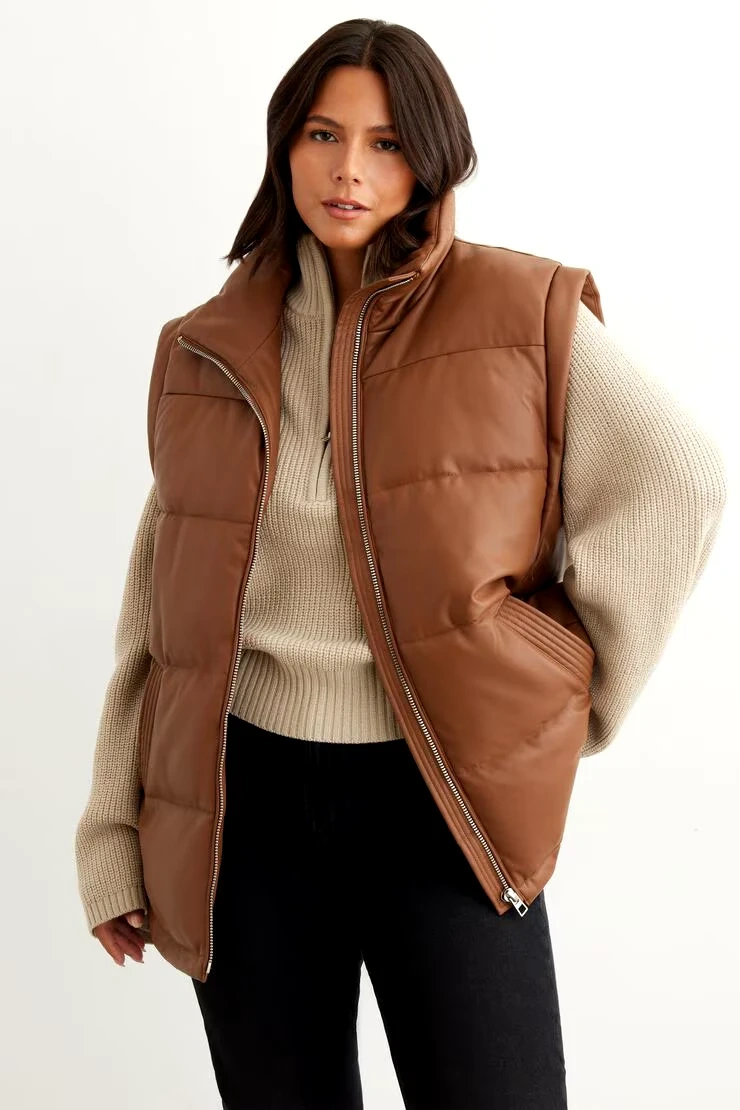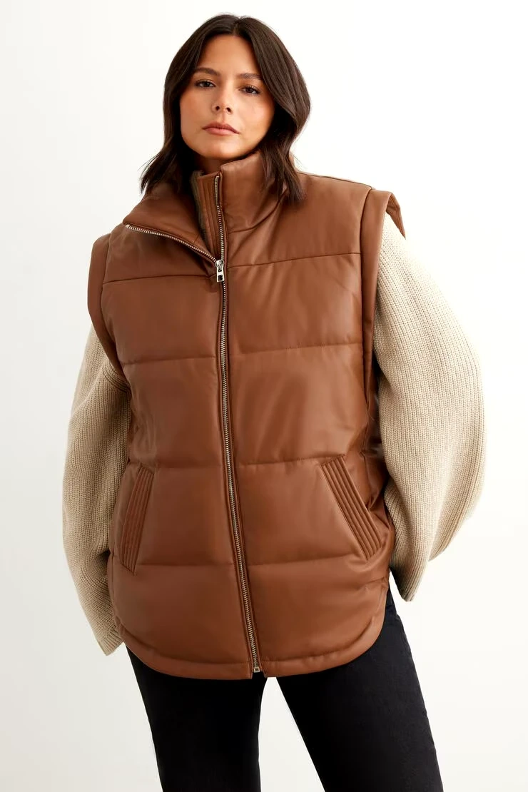 Selling a Dynamite faux leather puffer vest in a beautiful brown colour! It's new, not worn and is a size M/L. Perfect for adding a stylish layer to your outfits!