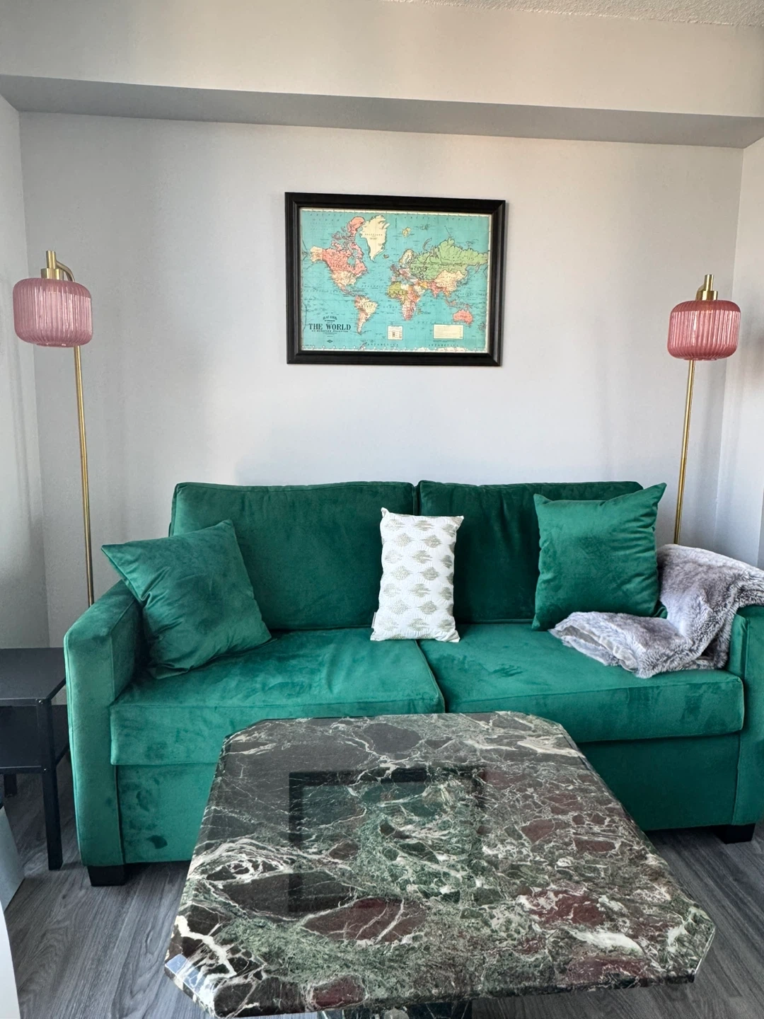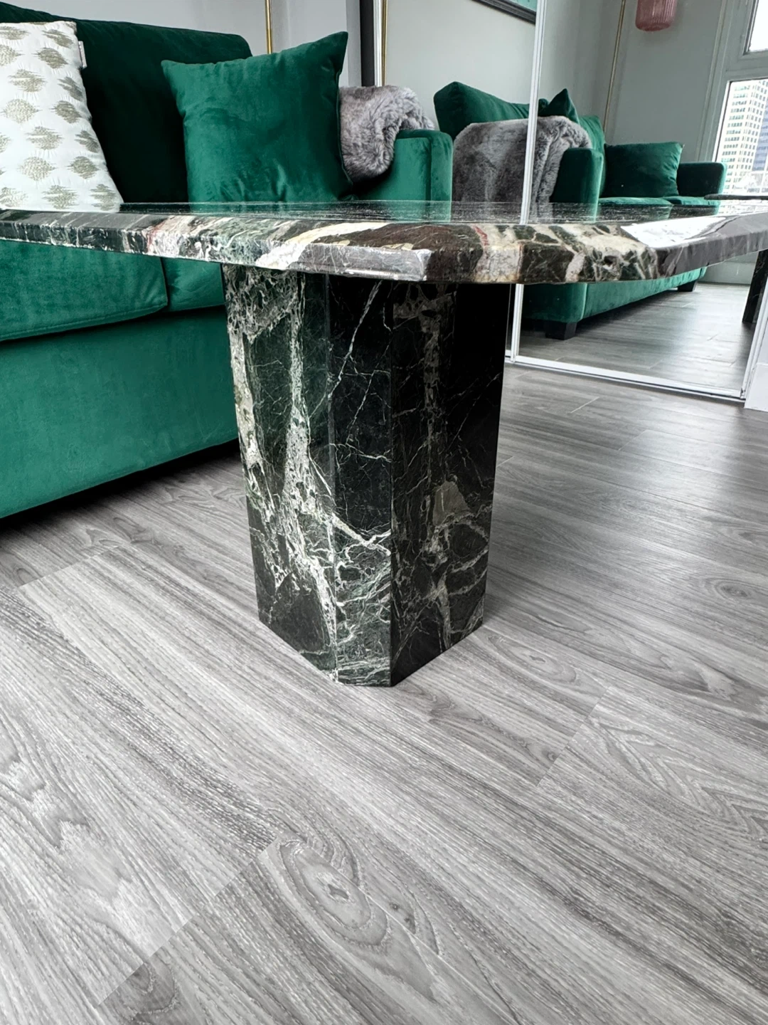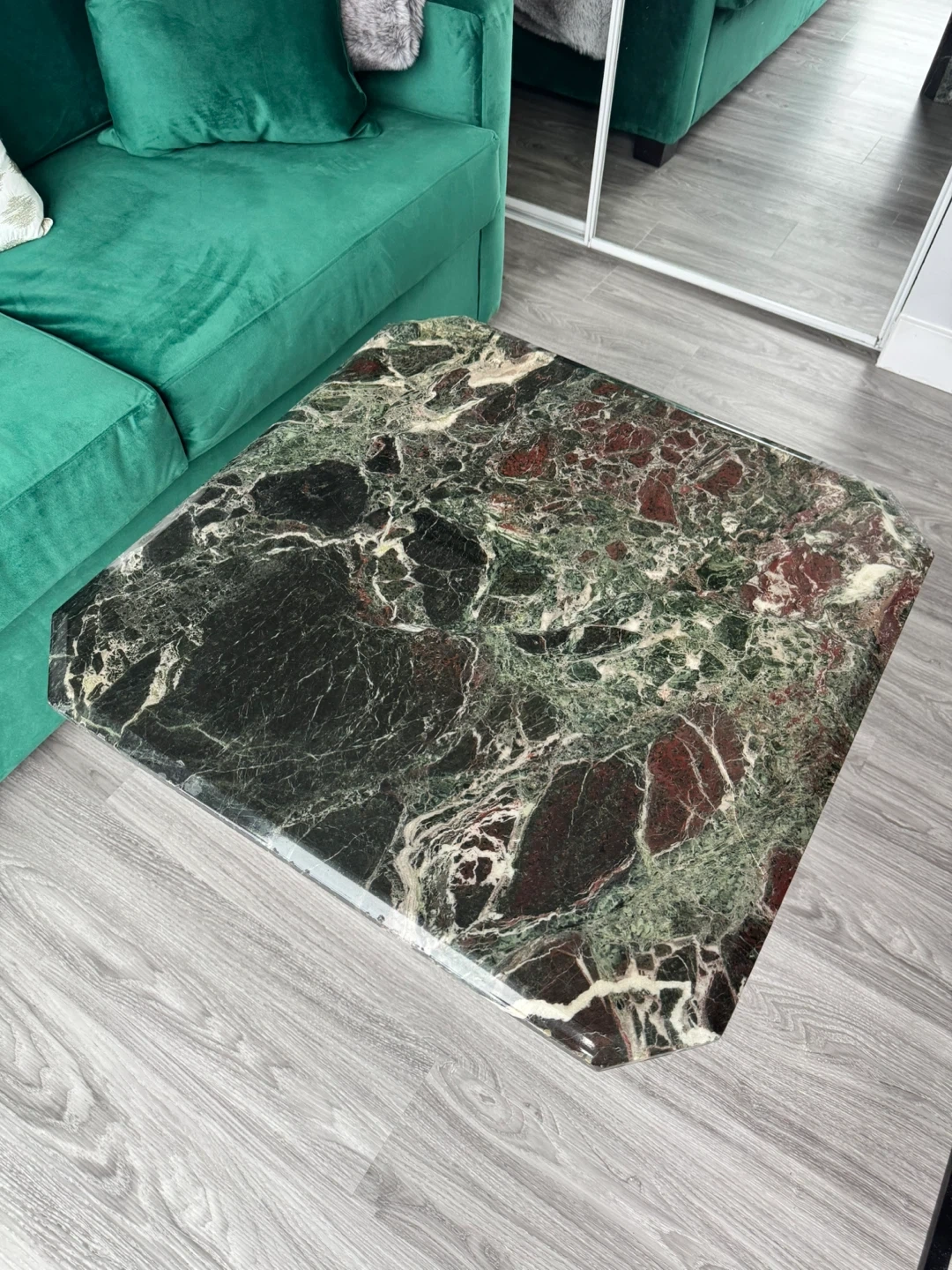 Selling a marble coffee table that was made in Italy. It has a beautiful and unique marble pattern with green, white, and red tones. It's a very heavy, stylish, and premium piece of furniture.