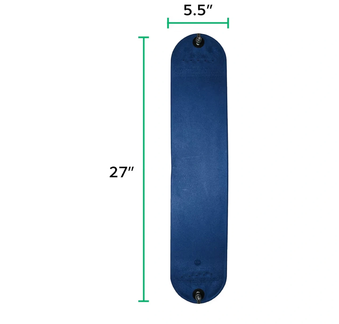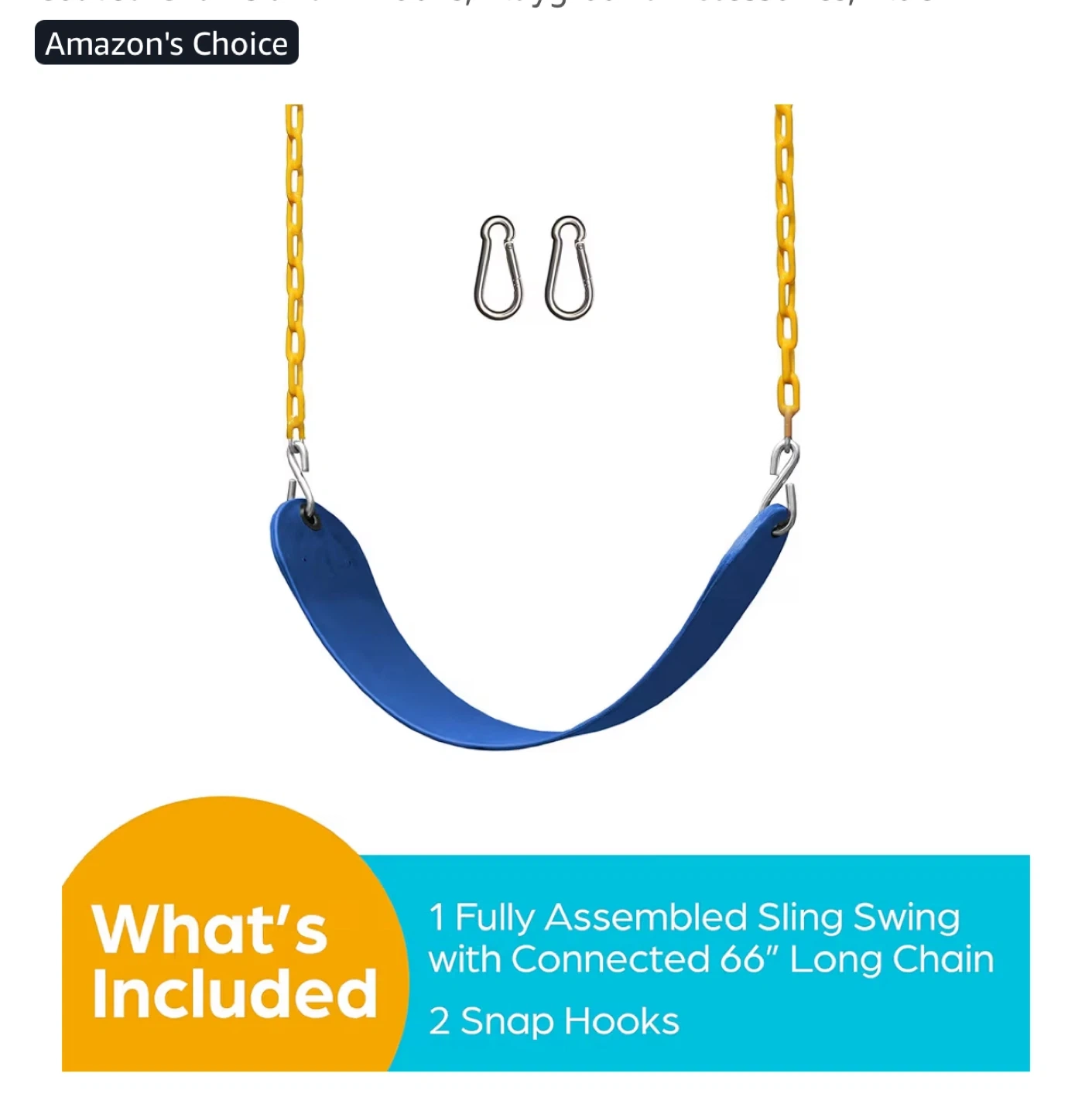 It's a blue and green, fully assembled sling swing with a connected 66" long chain and two snap hooks. The seat itself measures 27" x 5.5". Perfect for adding some fun to your backyard!