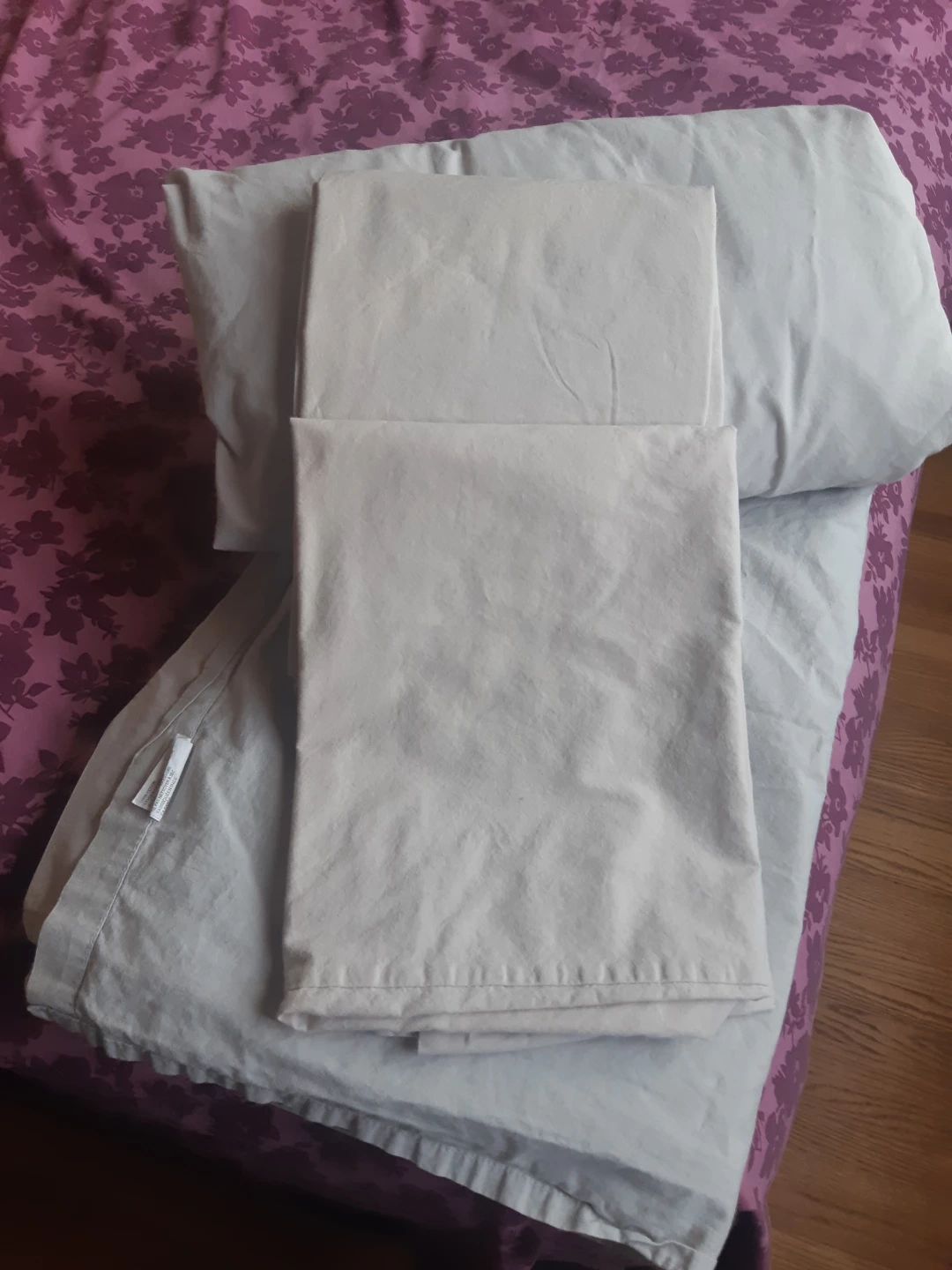 A beige queen sheet set made from 100% cotton! It's in great shape and ready for a new home. Includes tucked and flat sheets plus 2 pillow cases.