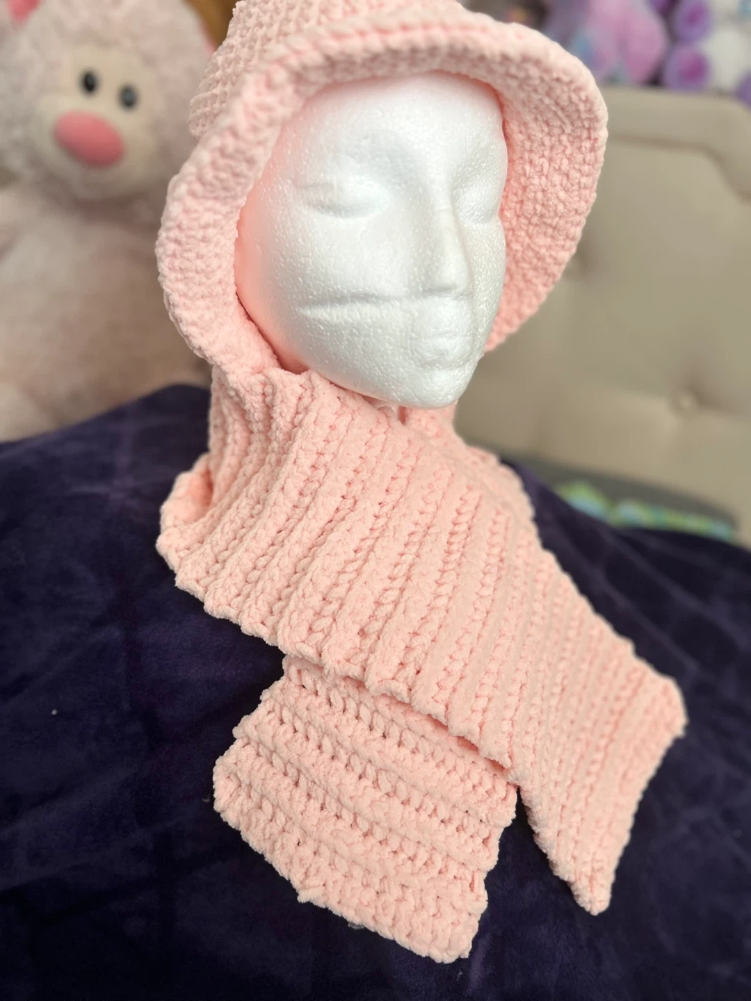 Selling a cute, handmade crochet hat and scarf set in a soft pink colour. It's in great condition and super cozy for the cooler weather!