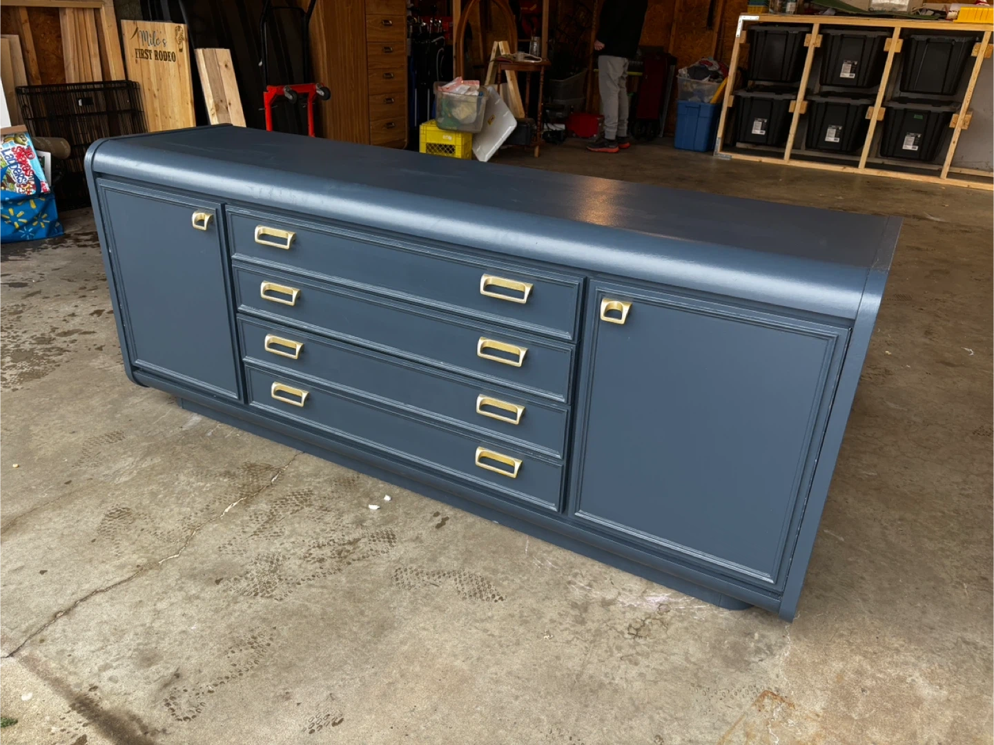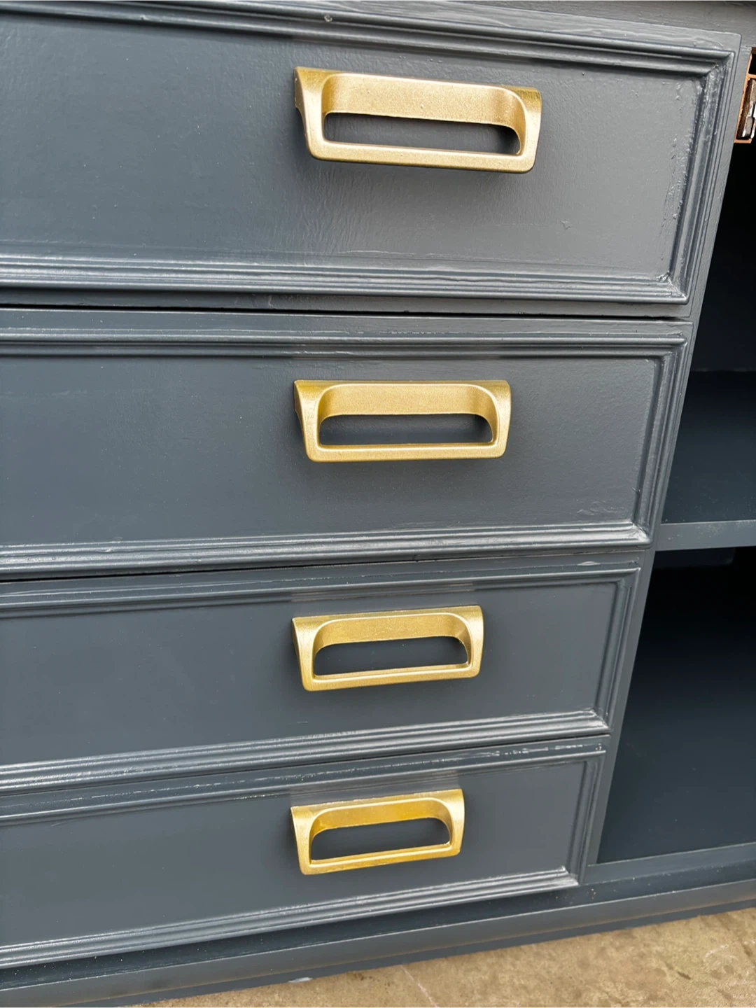 Primer and painted with Behr cabinet and door enamel with satin finish for a durable finish. Painted in Midnight Blue with gold hardware.