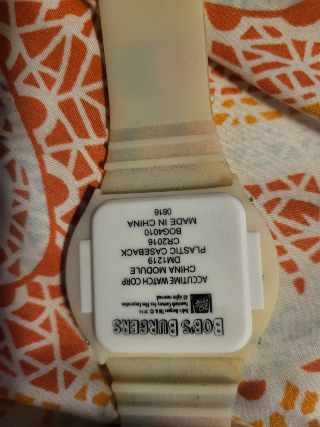 Buy & SellBob's Burgers Accutime WatchBob's Burgers Accutime Watch$15Selling a fun Bob's Burgers watch by Accutime! The band is yellow and features the Belcher family and a burger. The caseback is plasticBrandAccutimeWHERE TO MEETmartindaleView MapSELLERverifiedConorMartindale26624 reviews0 chats·0 favorites·2 views