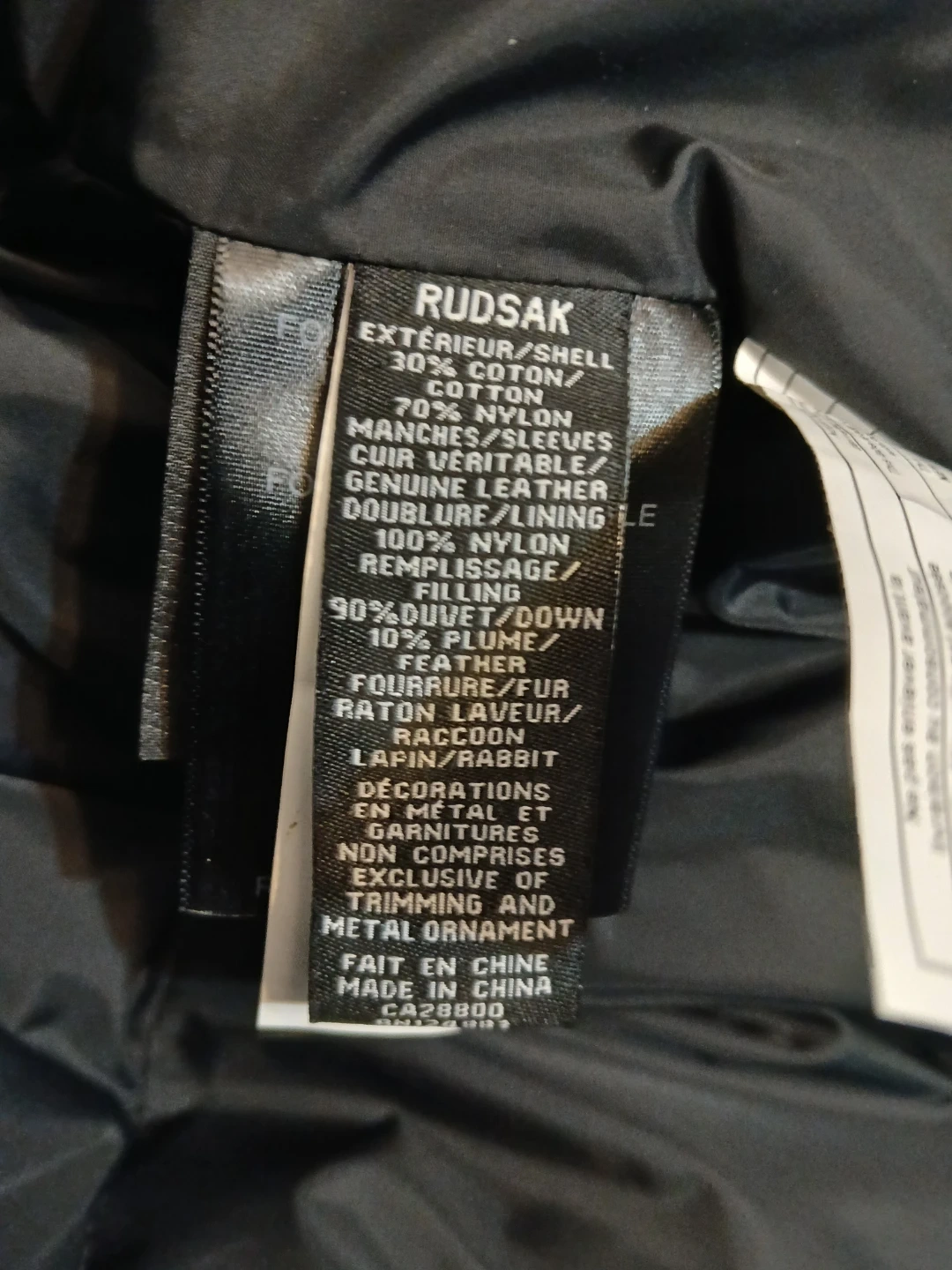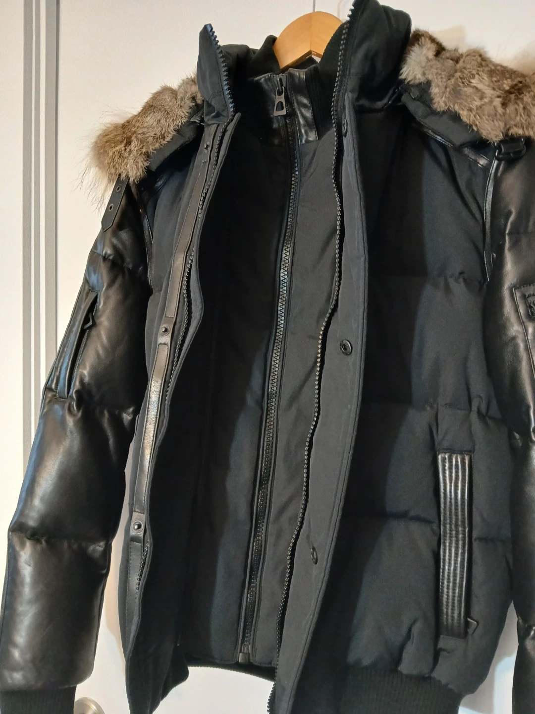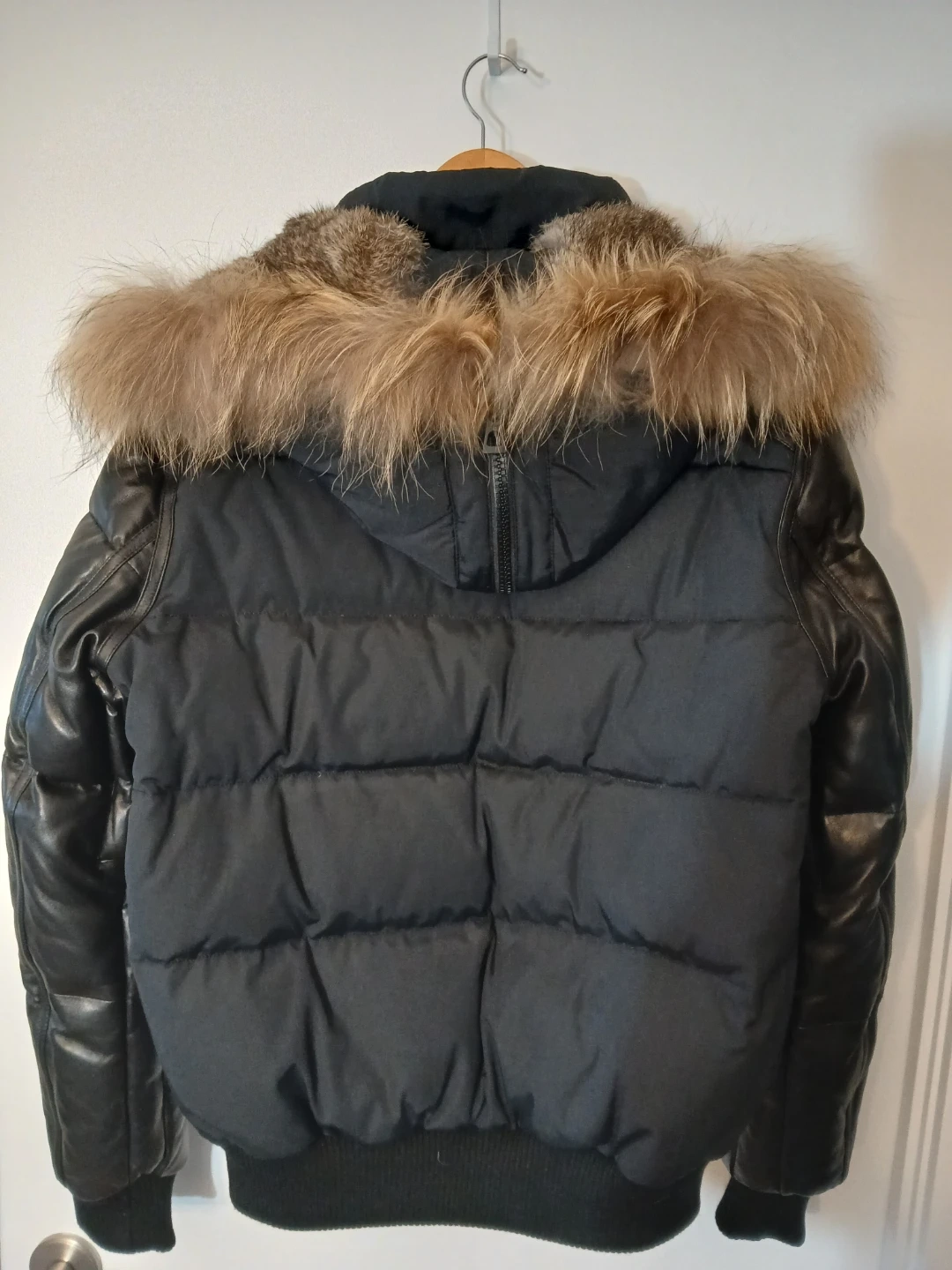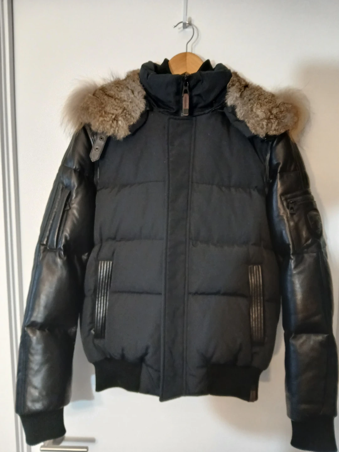 Note the warm, high quality materials! Down fill, genuine leather, and real fur on the removable hood.