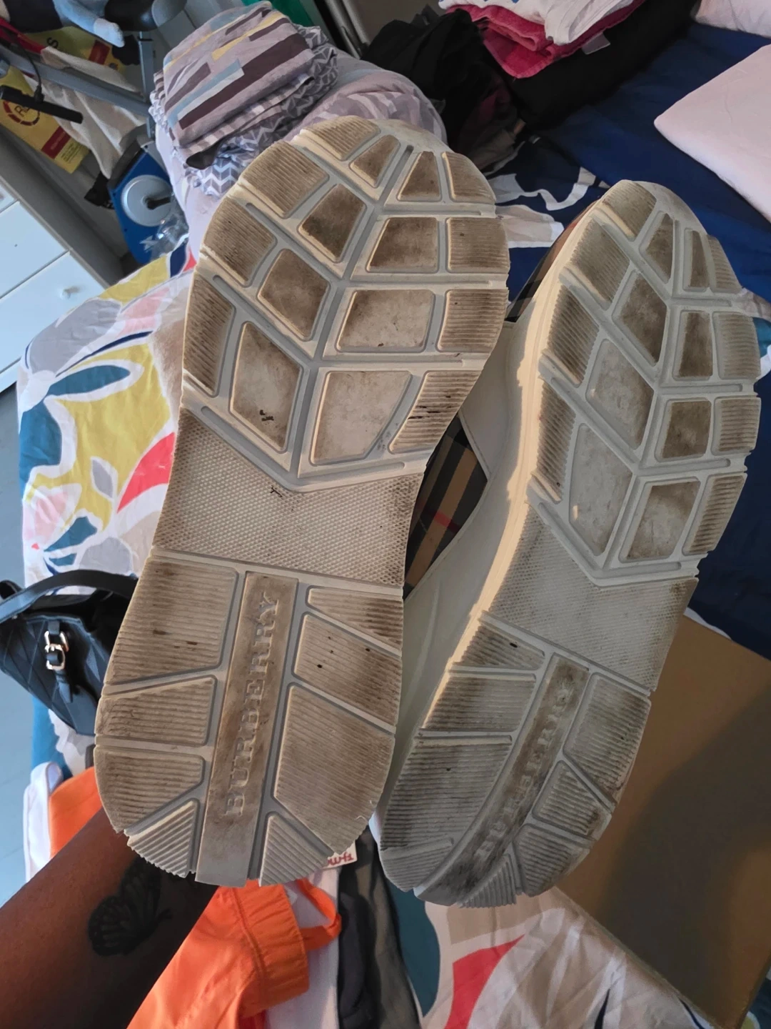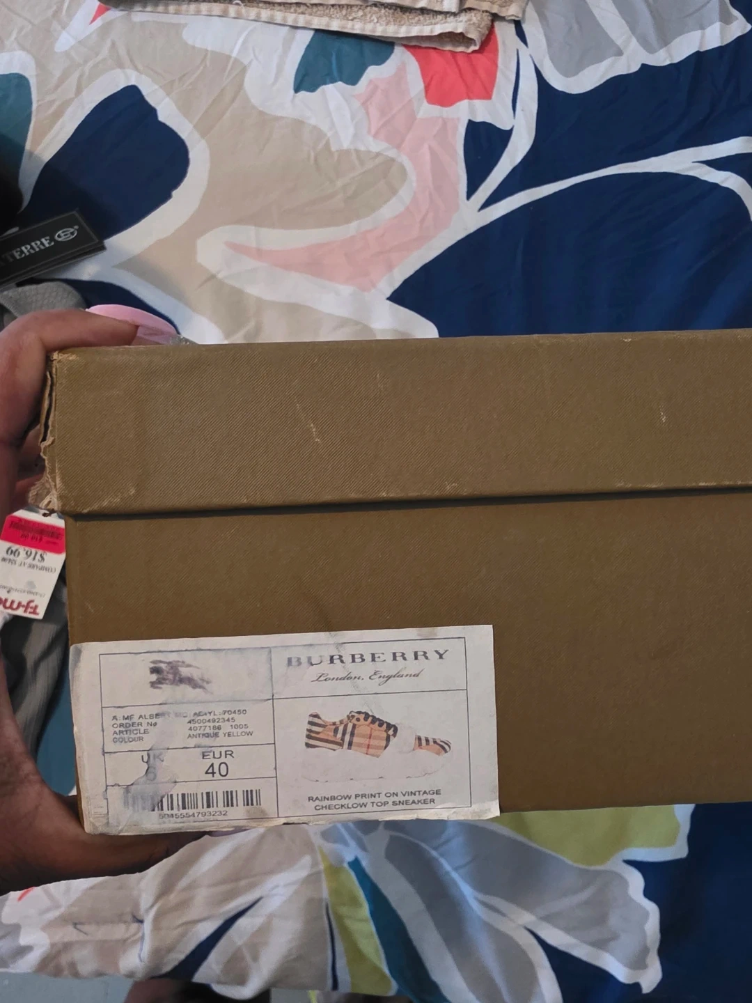 Selling a pair of Burberry Rainbow Print on Vintage Check Low Top Sneakers. These are a size EU 40 and come with the original box. The color is listed as Antique Yellow. The soles show signs of wear, but the uppers are in good condition!