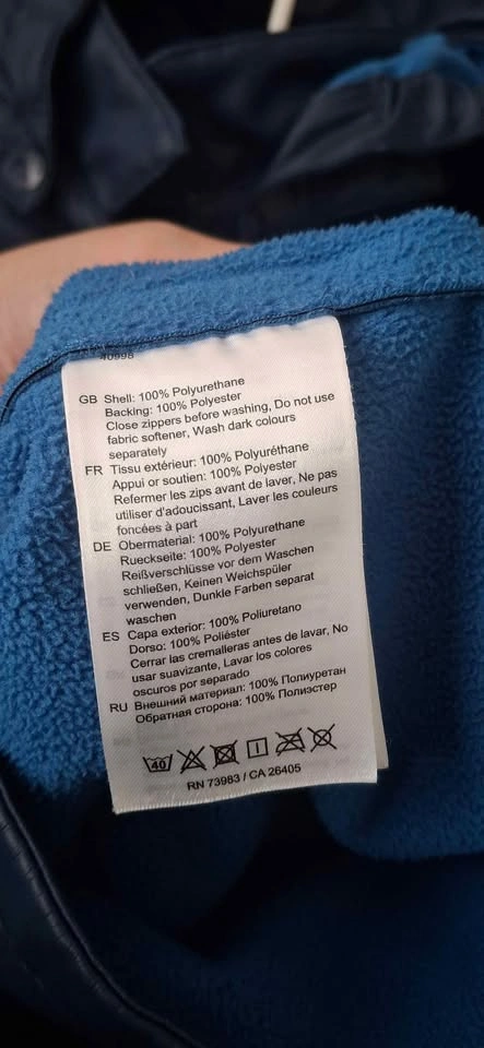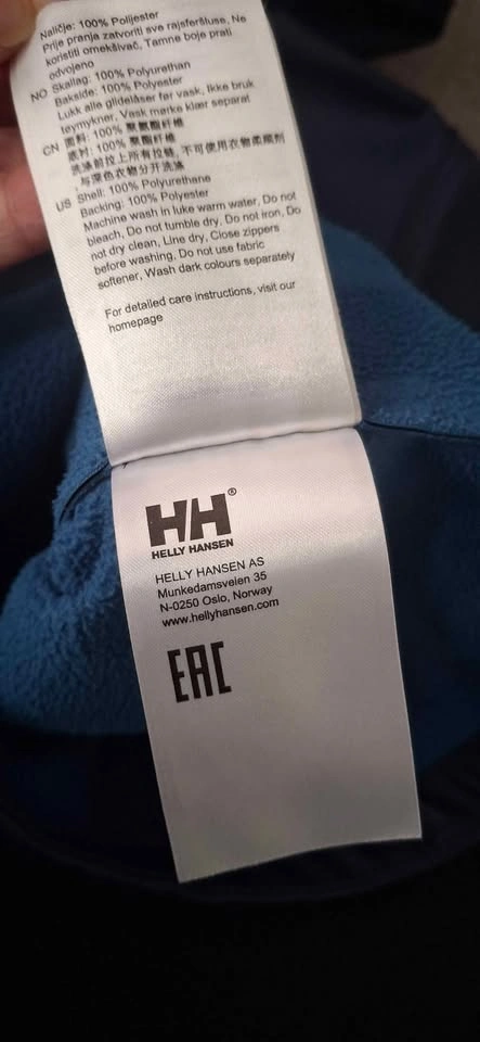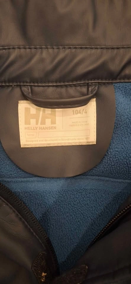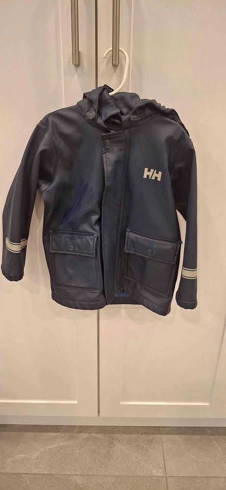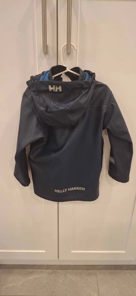 Good used condition. Smoke and pet free home. Navy blue Helly Hansen rain coat in size 4T. The zipper is a bit sticky but the snaps and Velcro work.