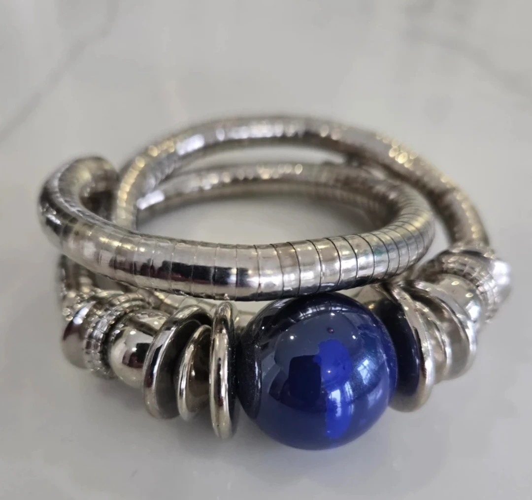 Here's a unique silver-tone bracelet featuring a striking blue stone accent. This bracelet is in great condition and ready to add a touch of elegance to your style