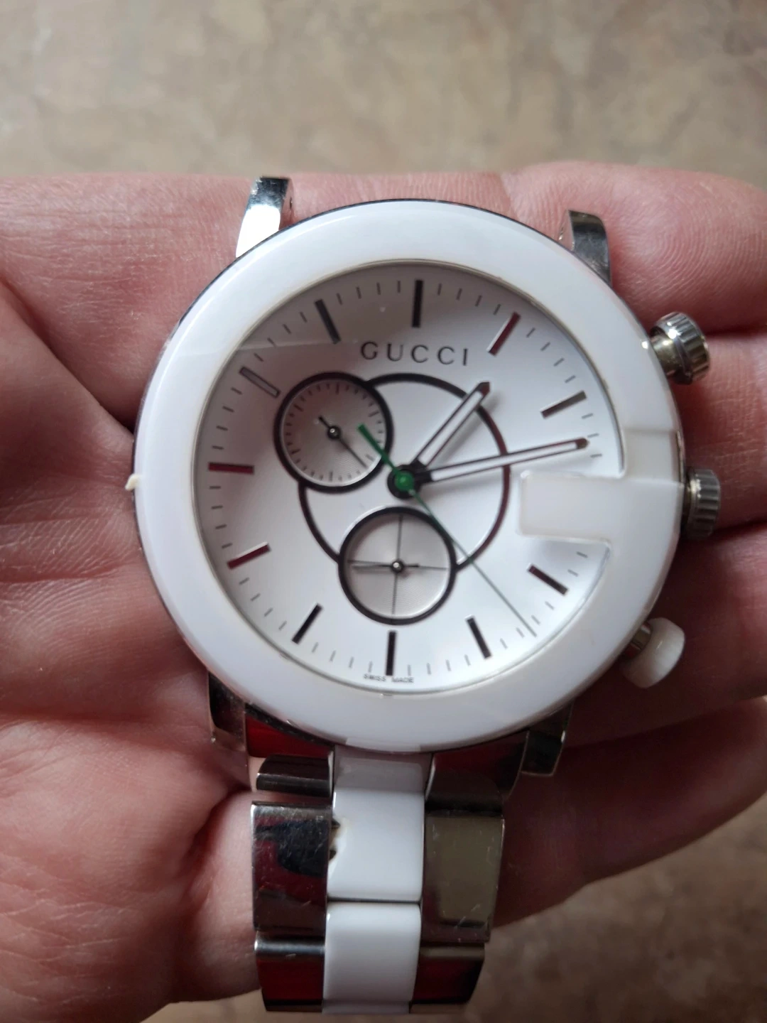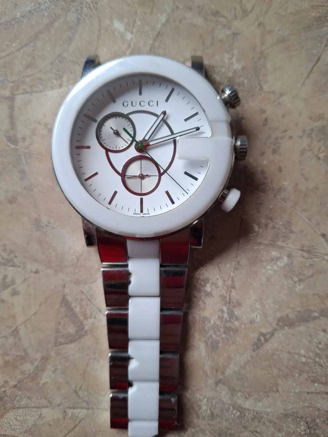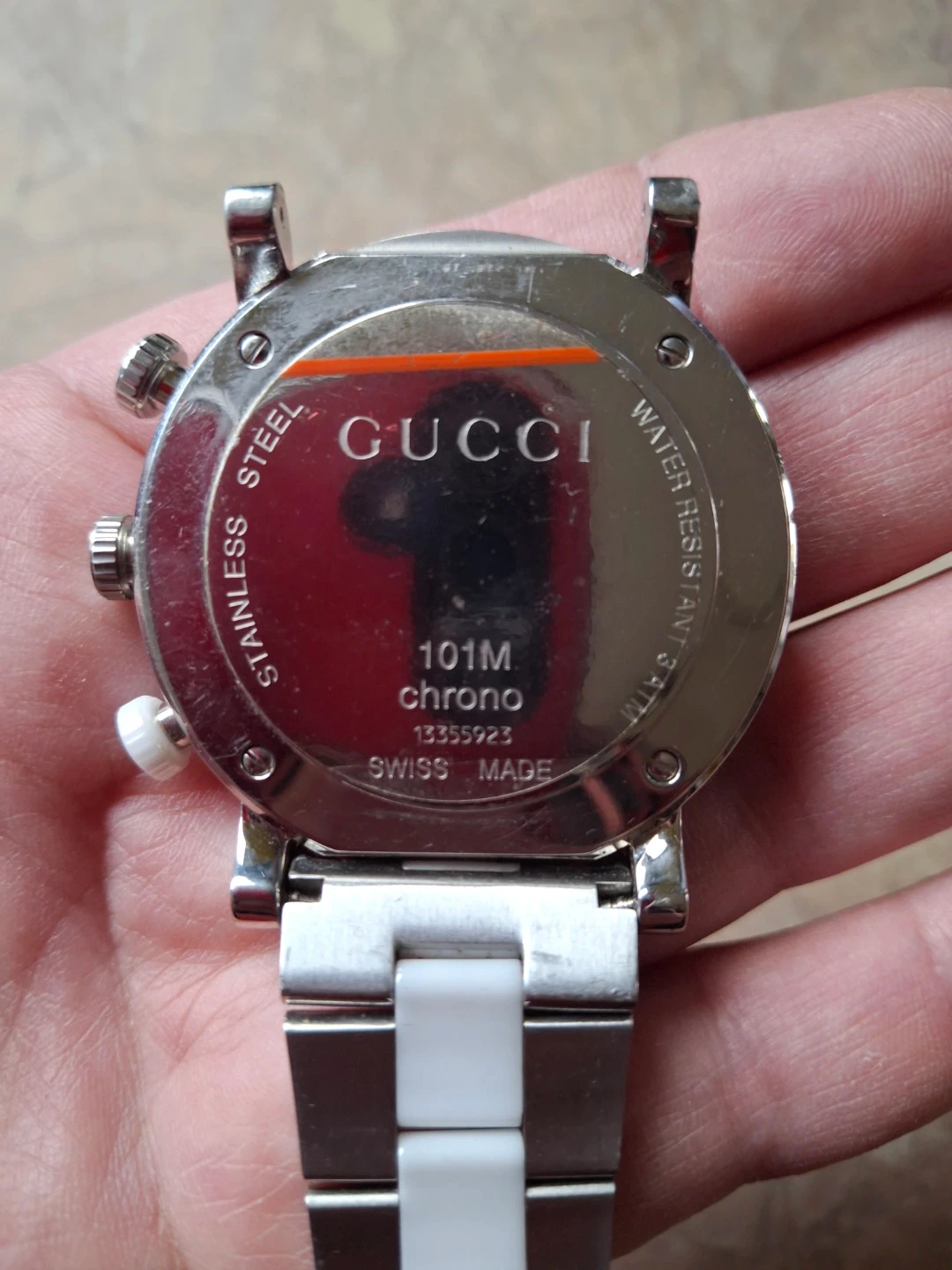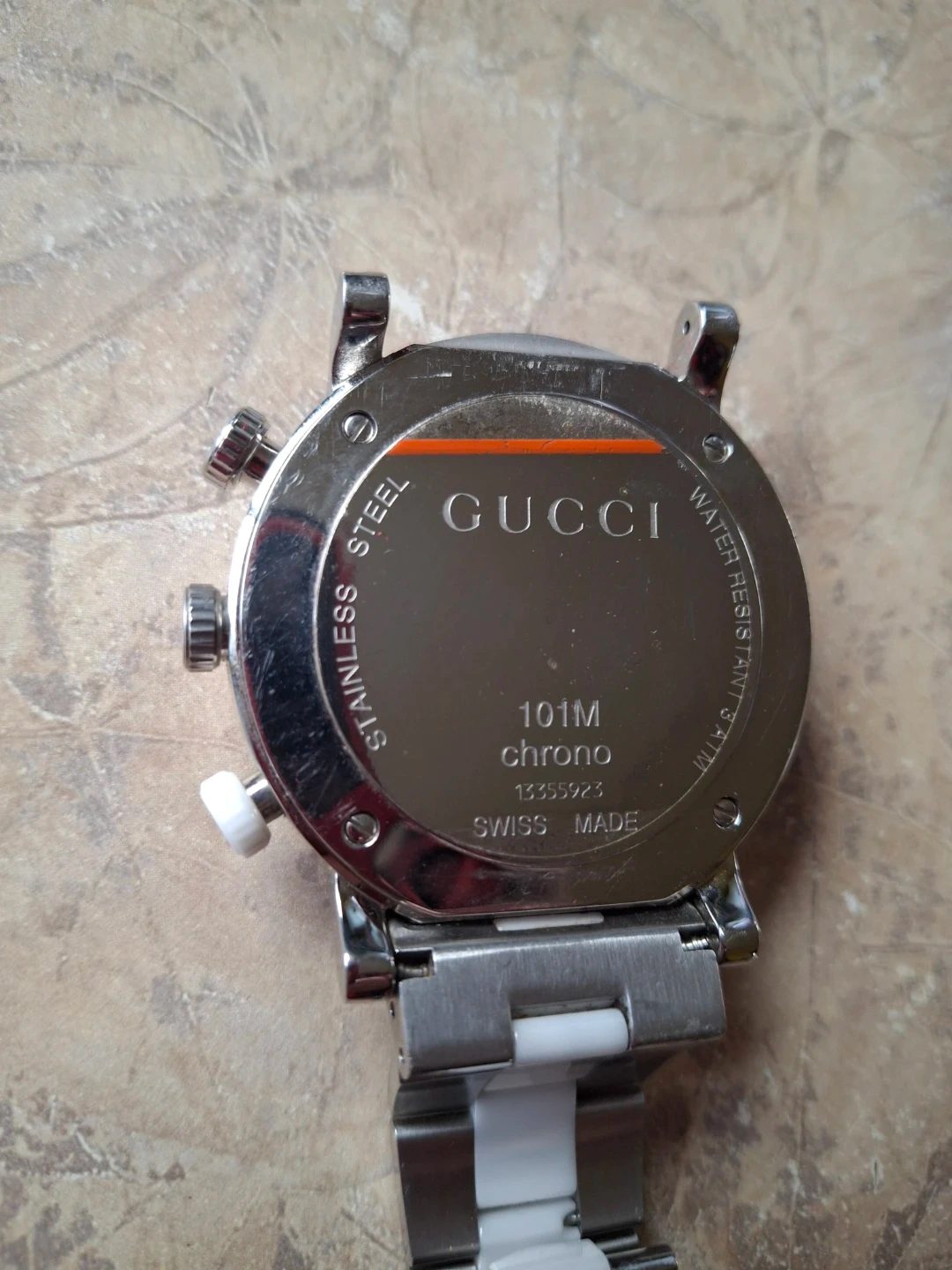 Selling a Gucci 101M Chrono watch. It features a stainless steel case and is water-resistant to 3 ATM. Swiss made. Bracelet is broken.