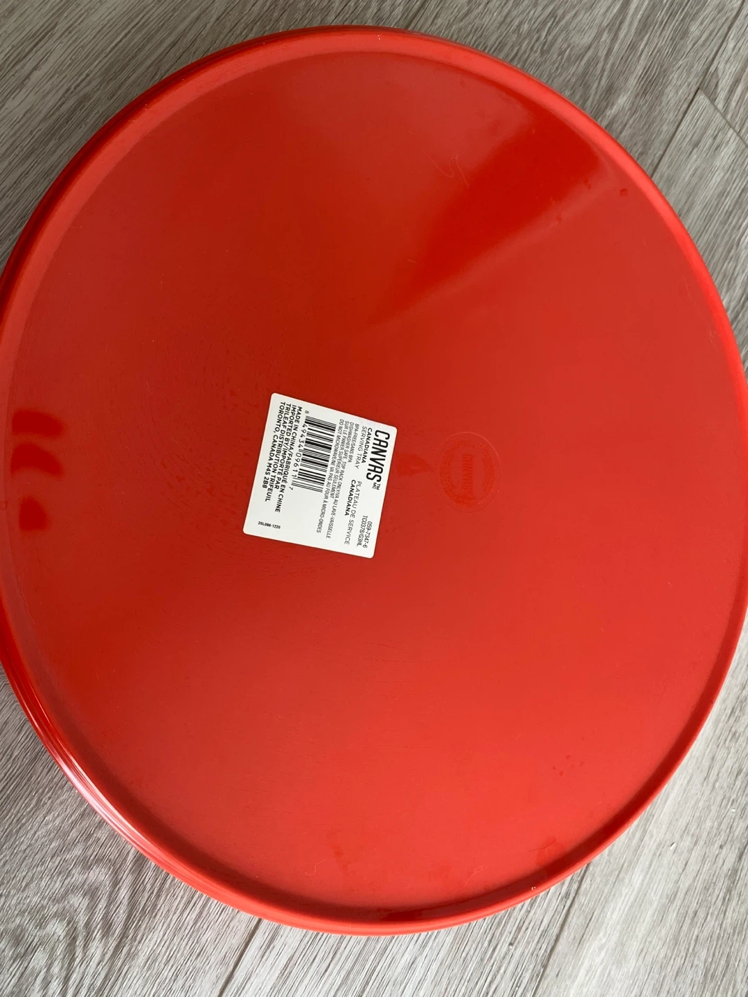 Selling a Canvas brand serving tray with a fun Canada design! The tray is round, with a white top featuring a map of Canada with various Canadian symbols and activities. The bottom of the tray is solid red. Perfect for serving snacks or drinks at your next gathering