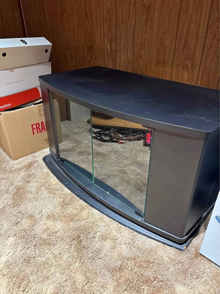 Sleek and sturdy black glass-door TV stand in great condition. Perfect for flat-screen TVs or as a compact media console.