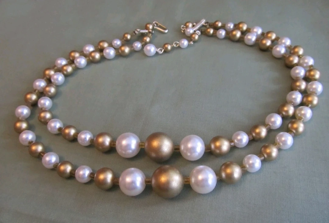 Selling a beautiful two-strand beaded necklace with gold and pearl-coloured beads.