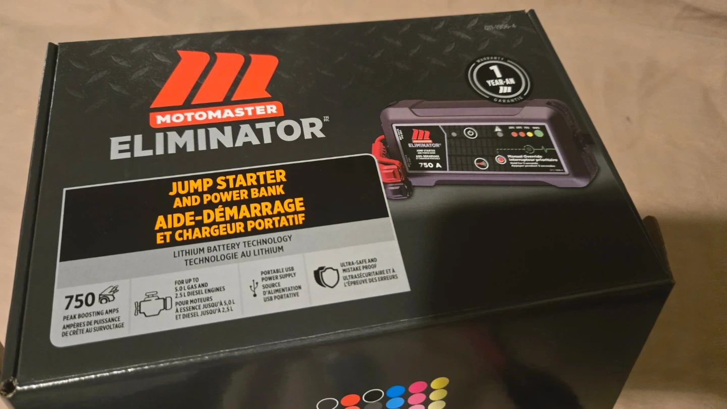 Selling a MotoMaster Eliminator 750A jump starter and power bank. It comes with its original box and all the included components, such as the charger and instructions.