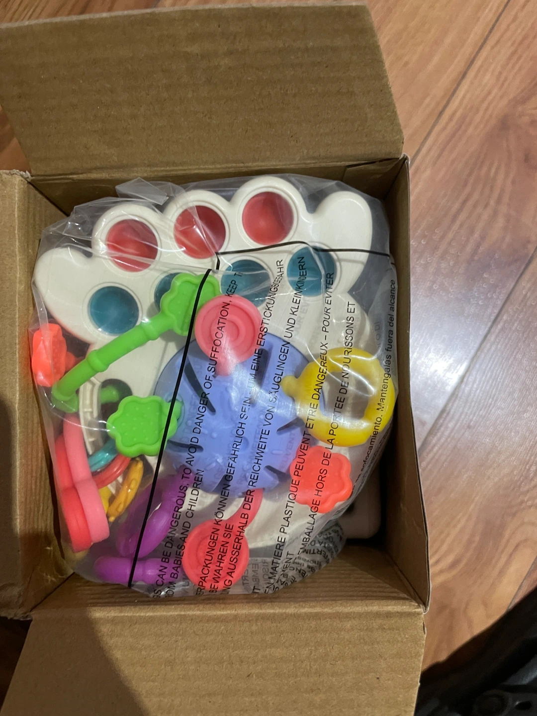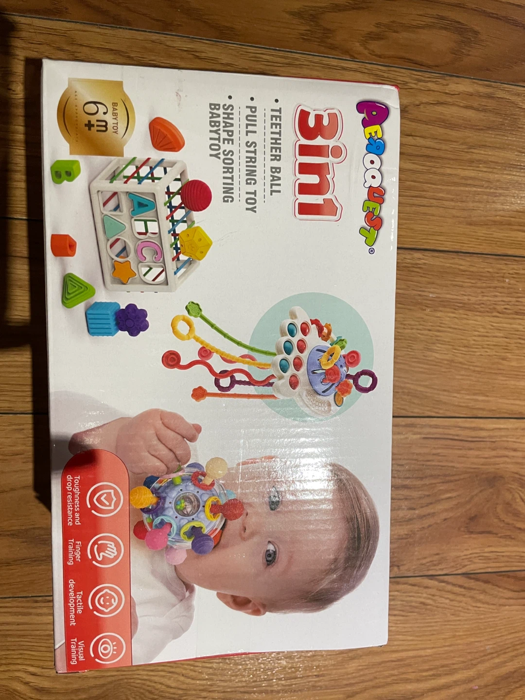 Selling a brand new Peacouquet 3in1 Montessori baby toy! This toy is suitable for babies 6 months and up. It includes a teether ball, pull string toy, and shape sorting baby toy. It's still in the original packaging.