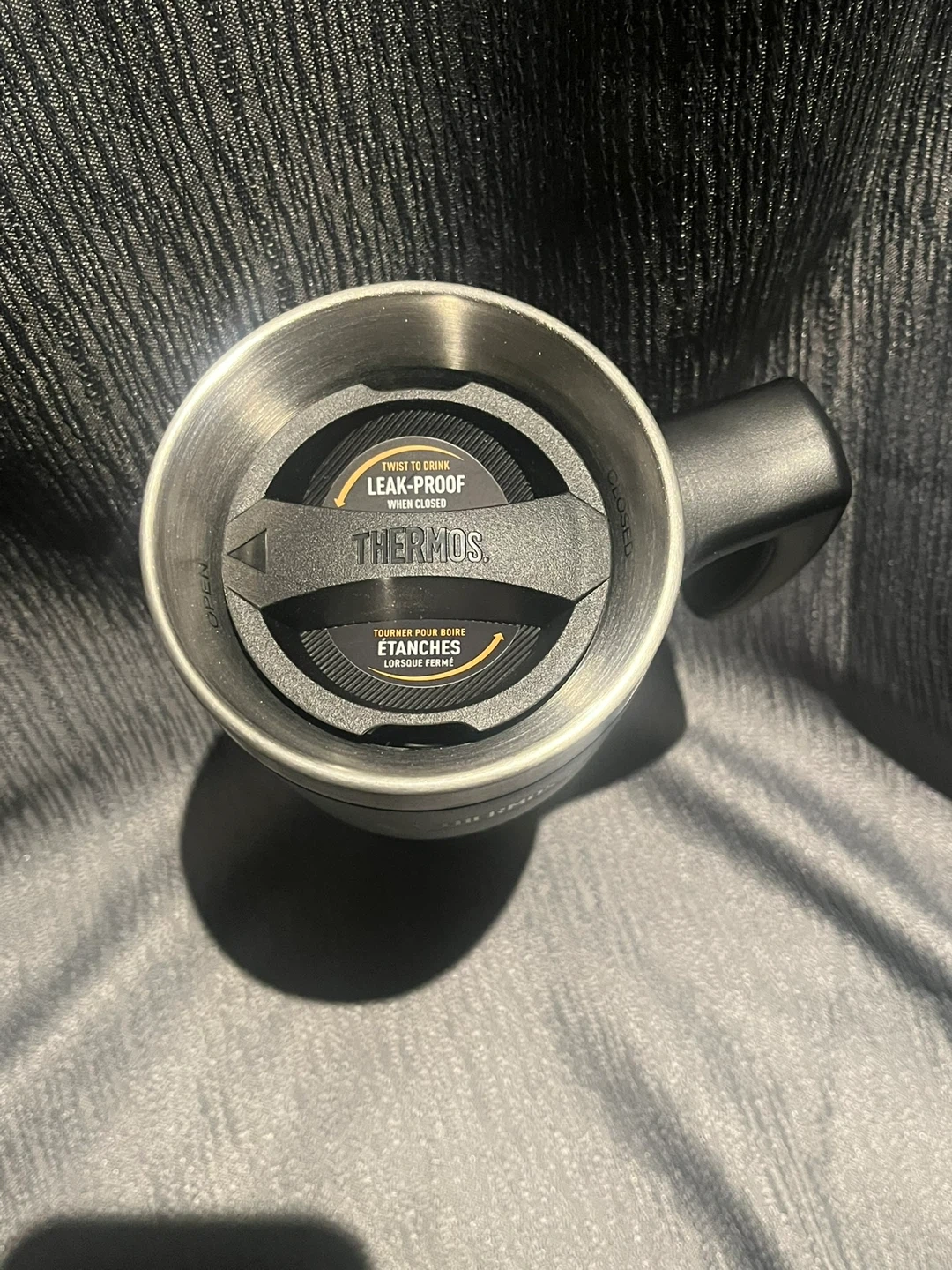 Selling a Thermos leak-proof mug! It keeps drinks hot or cold for hours. The mug has a twist-to-drink, leak-proof design when closed. Perfect for your morning coffee or tea!