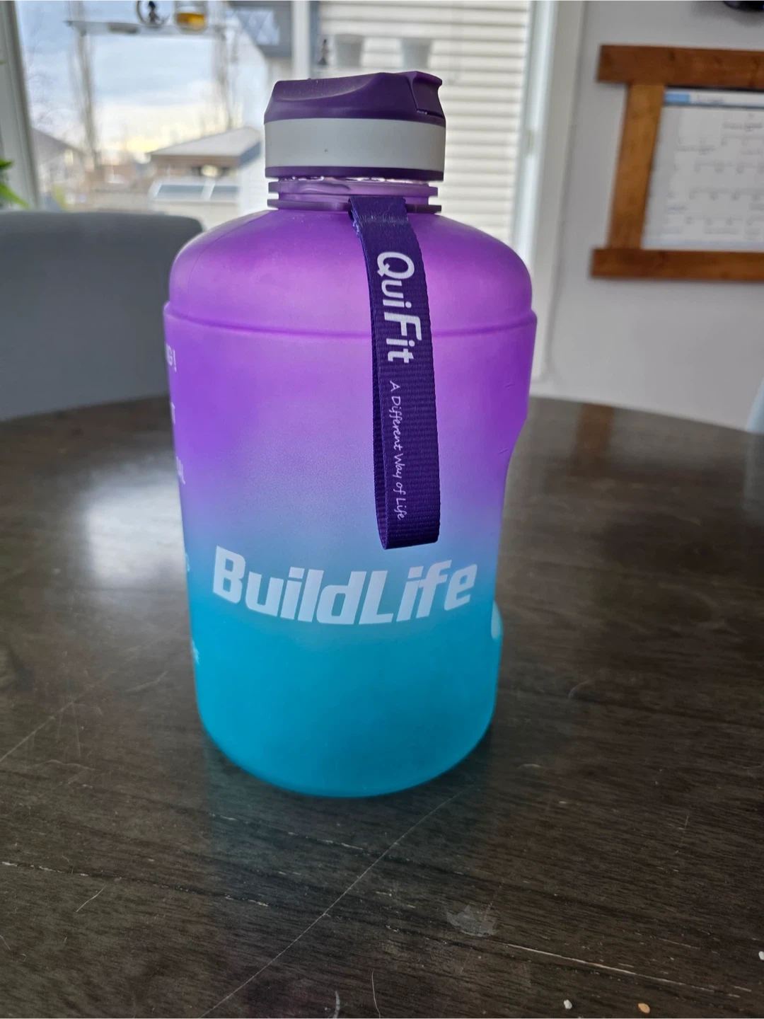 125Stay hydrated with this QuiFit BuildLife water bottle! It features a gradient design from purple to blue with time markers to help you track your water intake throughout the day. It's a great way to keep up with your hydration goals. Asking $15. Located in Cougar Ridge.