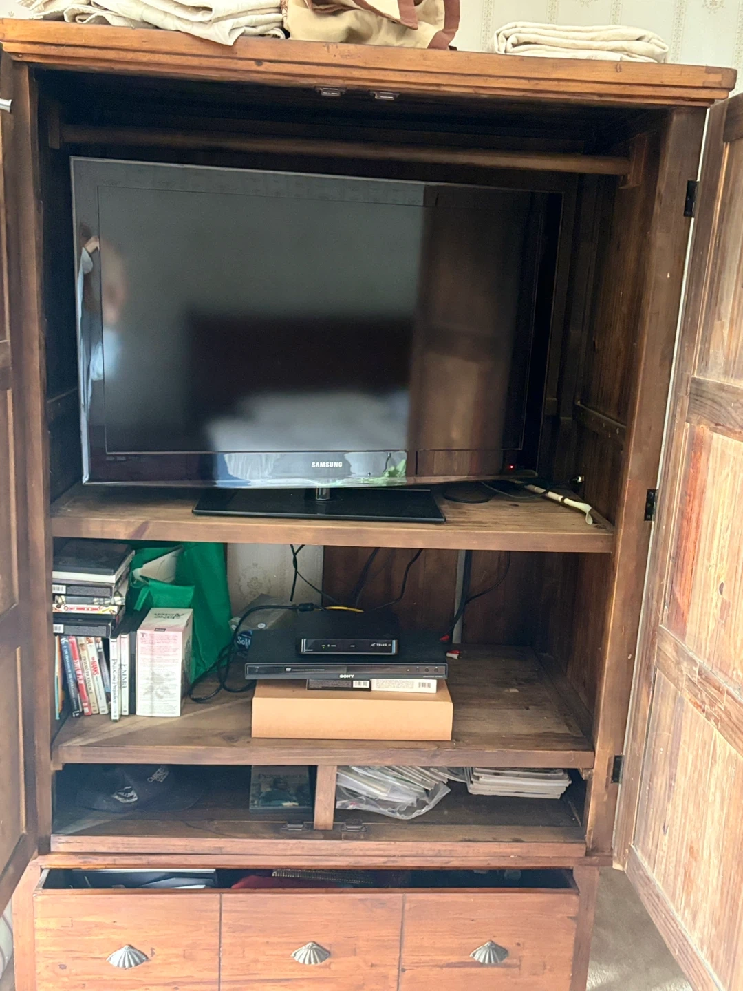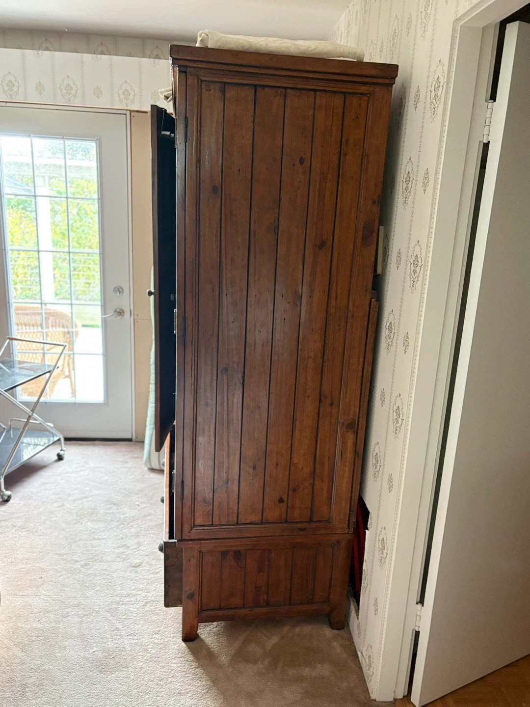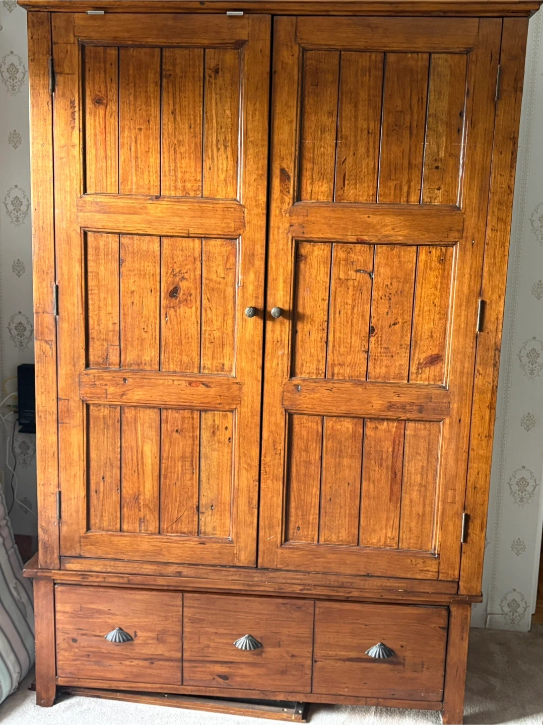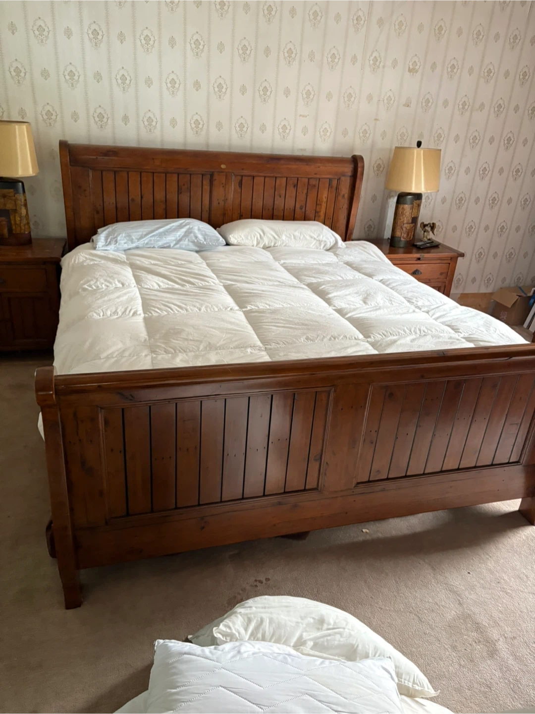 Bedroom set includes a king bed, armoire, dresser, mirror and two nightstands. All pieces are made of solid wood with a warm, natural finish. The wardrobe features ample storage with drawers and shelves. The nightstands each have a drawer and a cabinet for bedside essentials. Great condition.
