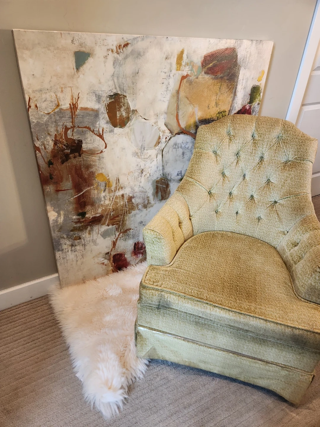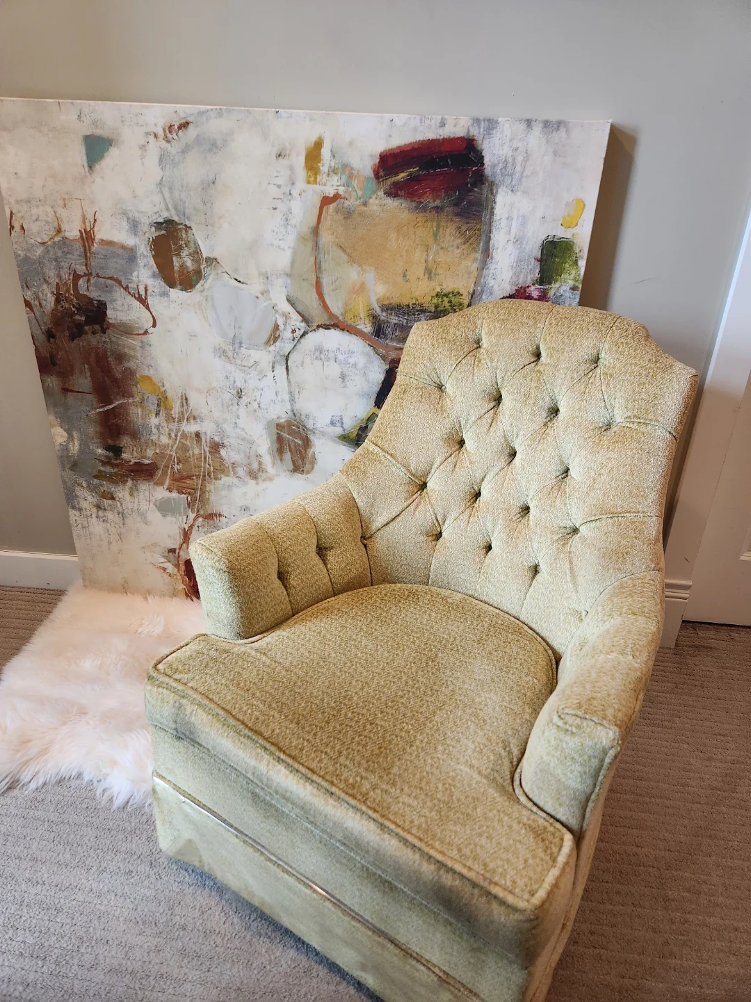 Say YES to this yellow chenille MID CENTURY armchair with a tufted back. It's a unique piece with a classic design. Could use a cleaning, but Comfty and stylish, living room or bedroom arm chair lounger has a great pop yellow a for delightful dopamin vibe. What a great addition to any space! Seat surface is 21x26 and 17inches high, 28 inches across arm to arm , top of chair back is 34 inches high.