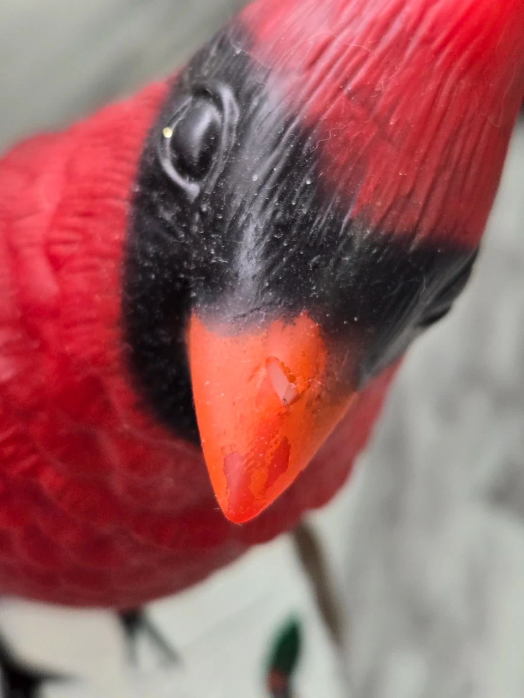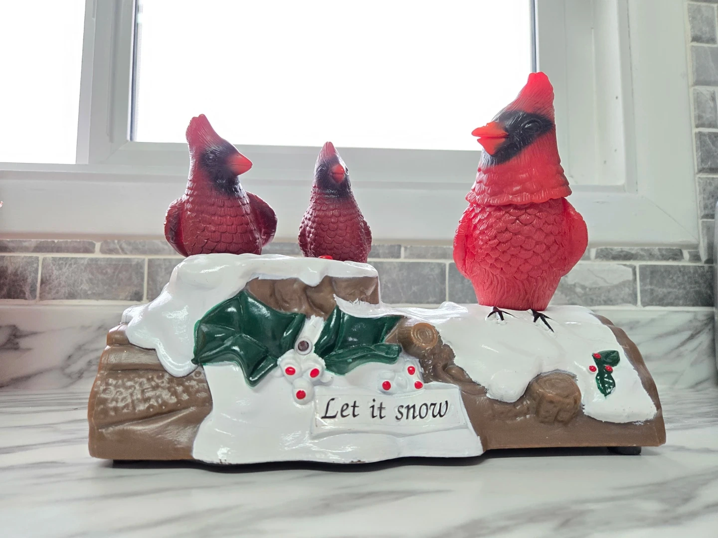 A charming decoration featuring three red cardinal birds perched on a snow-covered log. Sings and moves, It's perfect for adding a touch of winter whimsy to your home during the holidays!