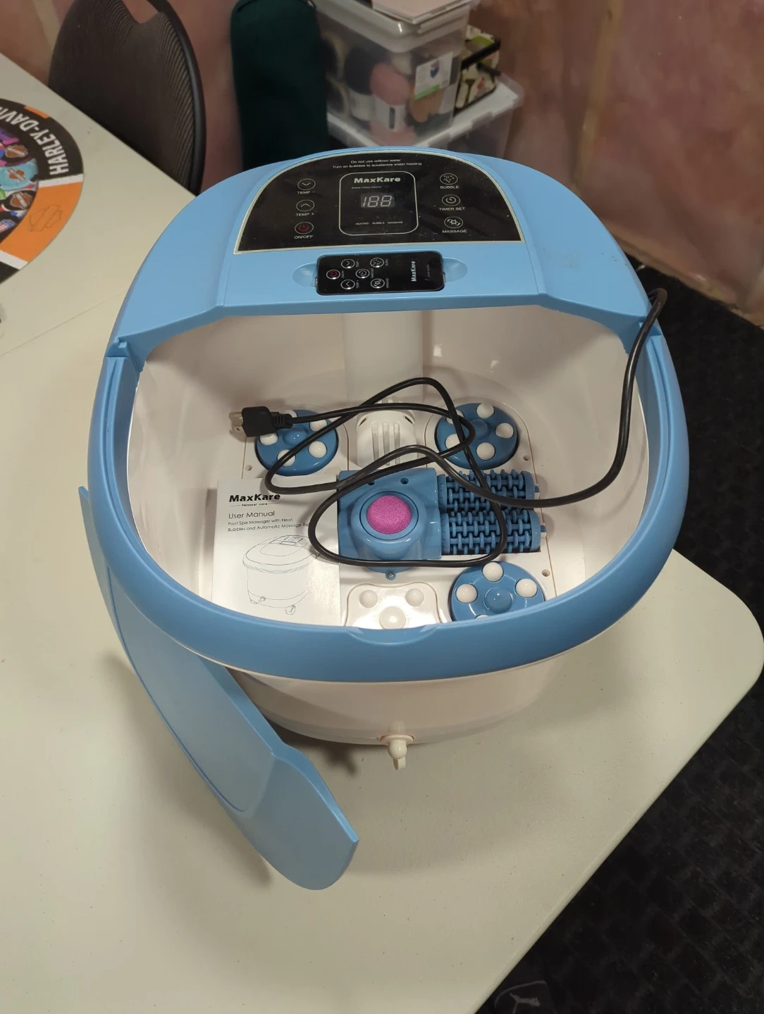 Selling a MaxKare foot spa massager. It comes with heat, bubbles, and automatic massage rollers for a relaxing spa experience at home! The user manual is also included.