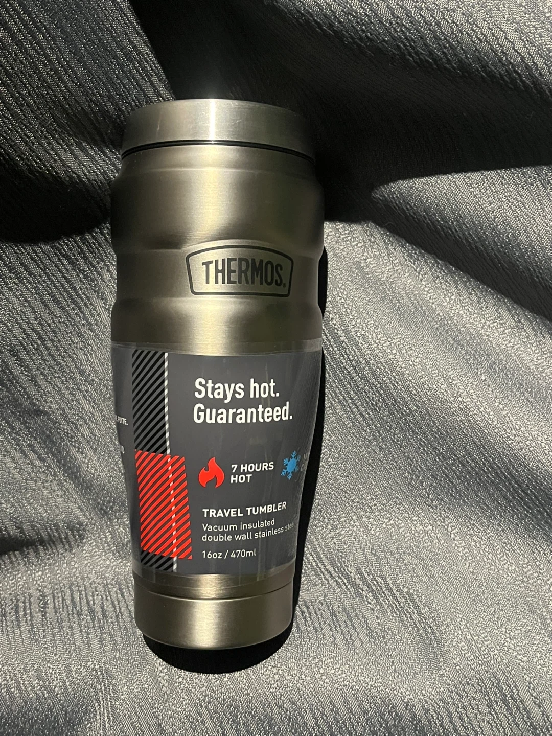 Keep your drinks hot for hours with this Thermos travel tumbler! It's vacuum insulated with double wall stainless steel and holds 16oz / 470ml. Stays hot. Guaranteed