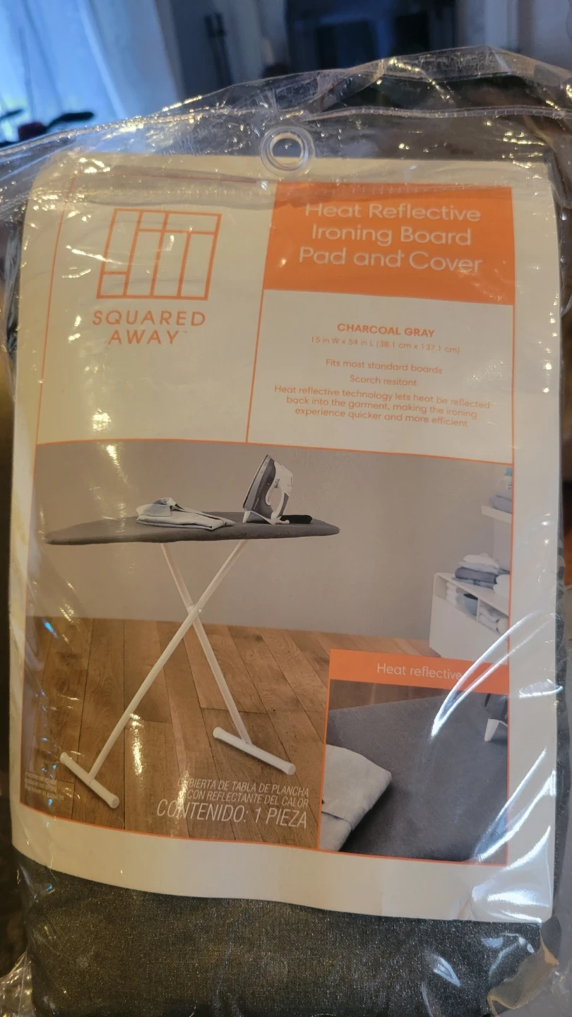 I have a brand new Squared Away Heat Reflective Ironing Board Pad and Cover. It's charcoal gray and measures 15 inches wide by 54 inches long (38.1 cm x 137.1 cm). It fits most standard boards and is scorch resistant! Heat reflective technology lets heat be reflected back into the garment, making the ironing experience quicker and more efficient