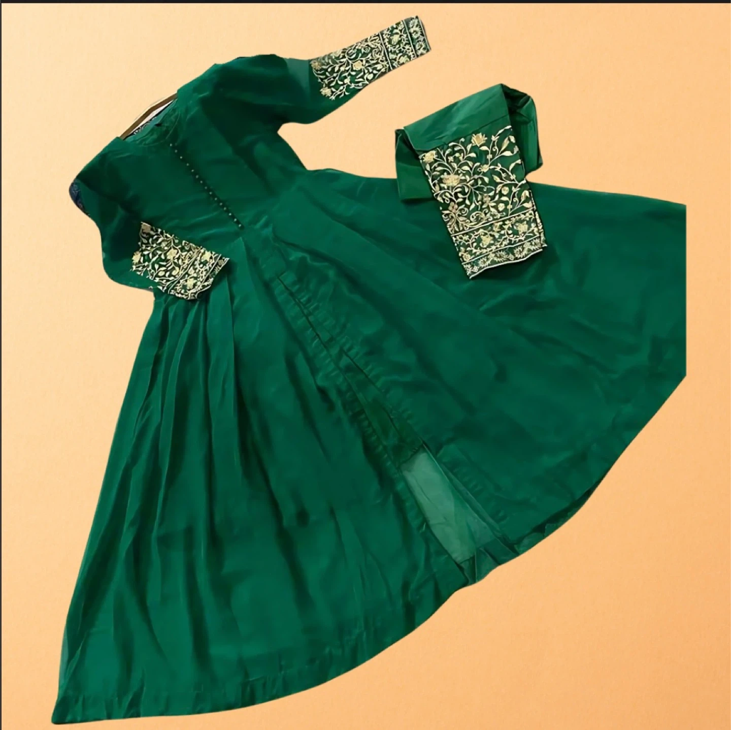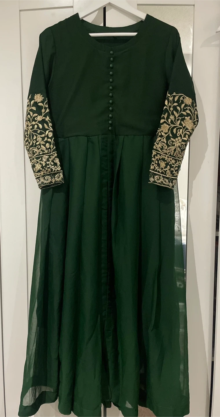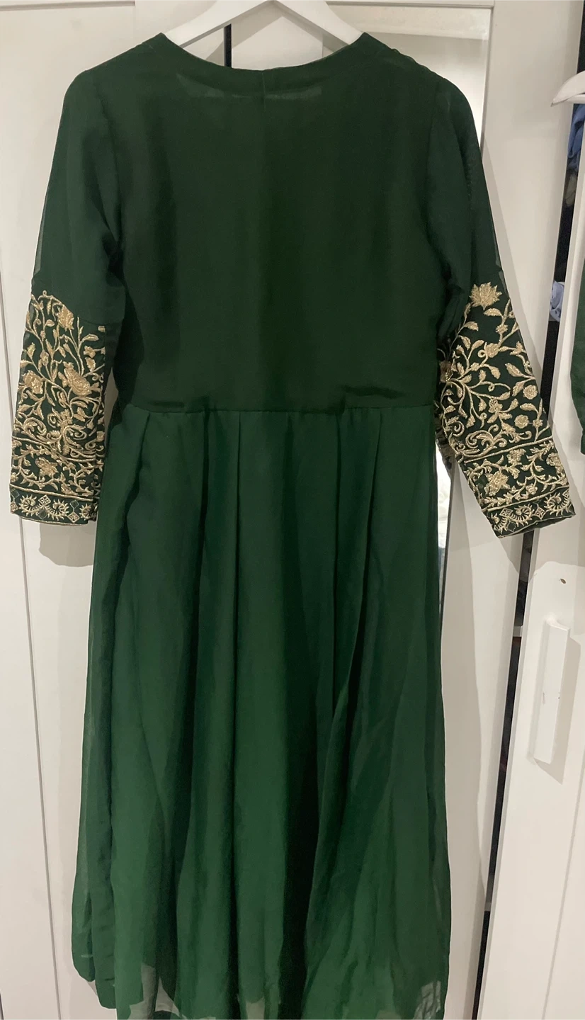 Condition: New Colour: Green Size: Medium Fabric: Chiffon Chest size- 18 inches Beautiful 3-piece chiffon maxi dress featuring an attached inner for a graceful flow, paired with soft malai crepe trousers and a lightweight chiffon dupatta. Pick up only/cash only