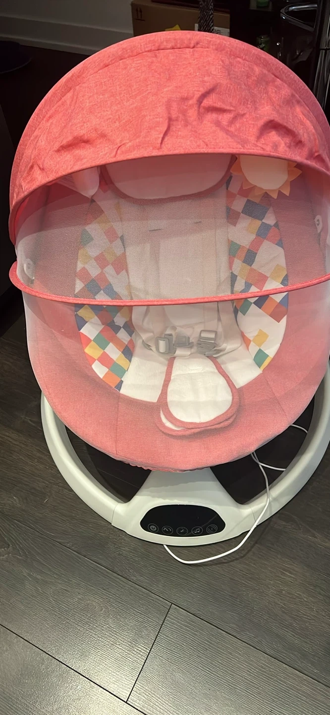 Selling a baby rocker with a canopy. It's in great condition and has a cute design with a cloud and sun toy hanging from the top. It also has a mosquito net to keep the bugs away from your little one. Perfect for keeping baby comfortable!