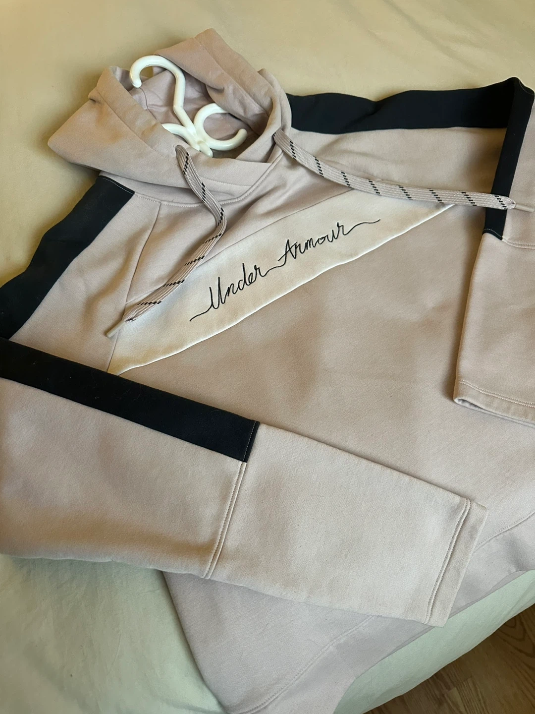 Selling a comfy Under Armour hoodie in size medium. It's in great shape and ready for a new home! The colour is a light pink with black accents. Perfect for workouts or just lounging around!