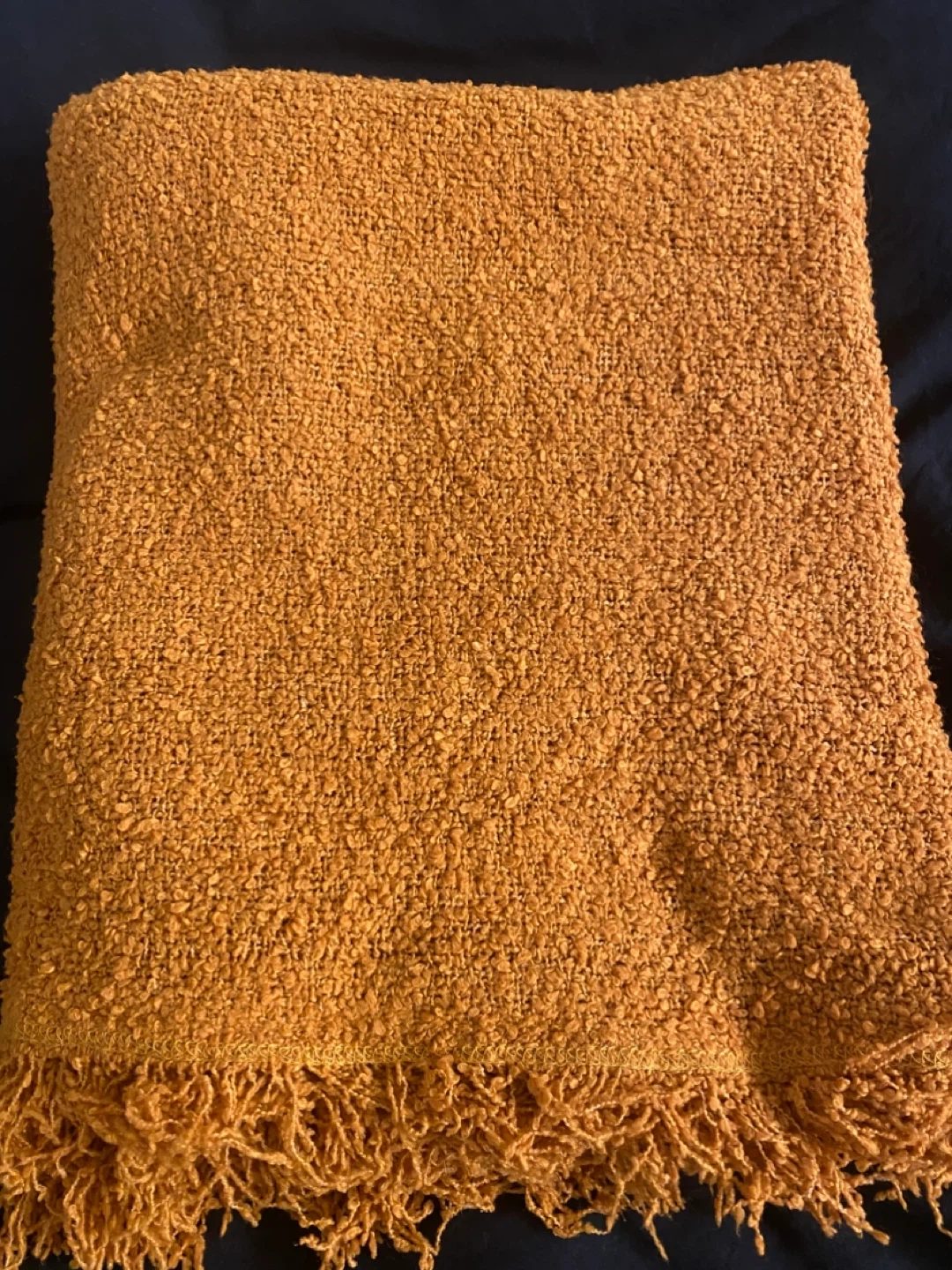 Cozy orange throw blanket in great condition! Perfect for adding a pop of colour and warmth to your living space or bedroom. The blanket features a textured weave and fringed edges, making it a stylish and comfortable addition to your home decor